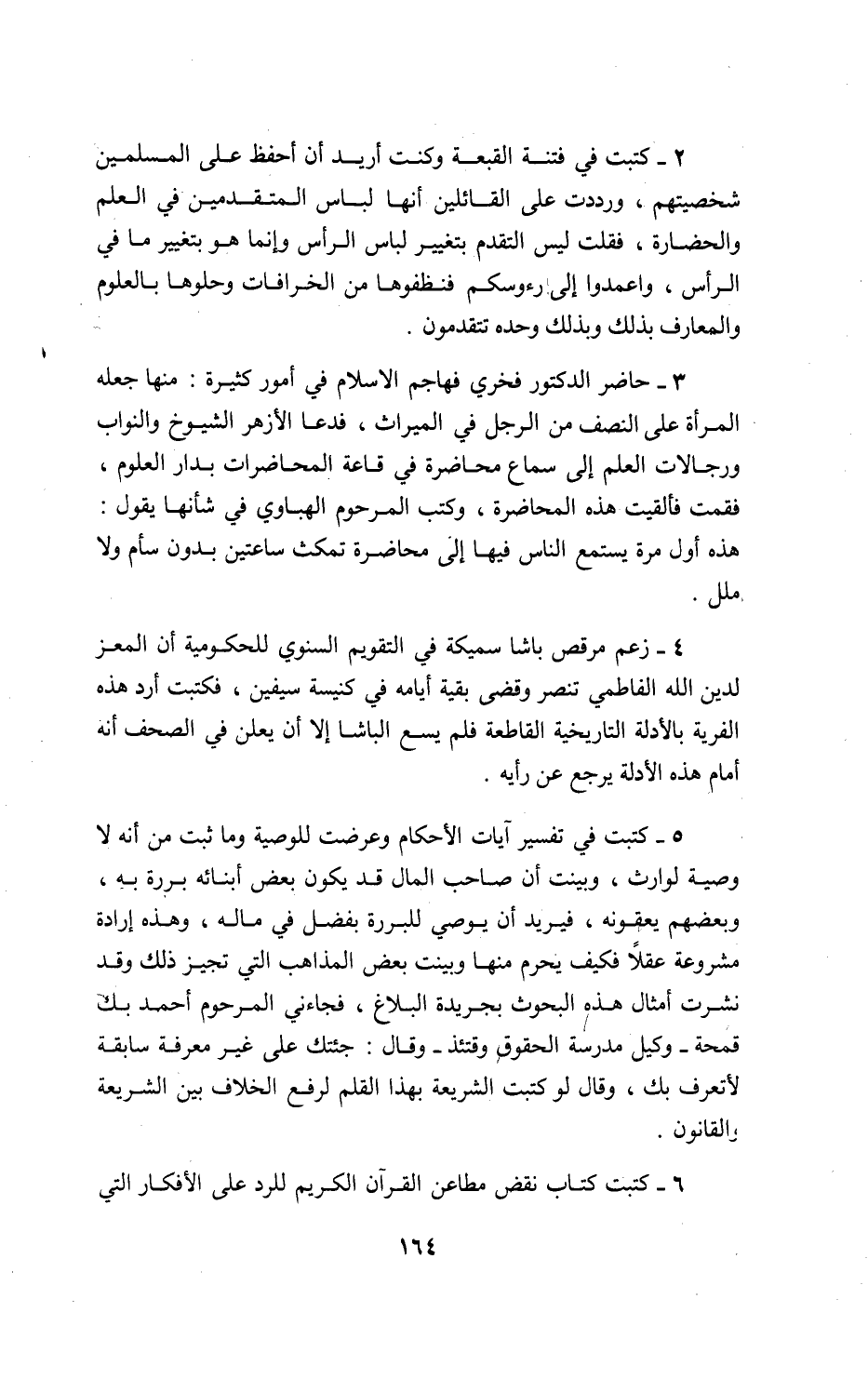 5 - كتبت في تفسير آيات الأحكام وعرضت للوصية وما ثبت من أنه لا وصية لوارث، وبينت أن صاحب المال قد يكون بعض أبنائه بررة به، وبعضهم يعقونه، فيريد أن يوصي للبررة بفضل في ماله، وهذه إرادة مشروعة عقلا فكيف يحرم منها وبينت بعض المذاهب التي تجيز ذلك وقد نشرت أمثال هذه البحوث بجريدة البلاغ، فجاءني المرحوم أحمد بك قمحة-وكيل مدرسة الحقوق وقتئذ-و قال: جئتك على غير معرفة سابقة لأتعرف بك، وقال لو كتبت الشريعة بهذا القلم لرفع الخلاف بين الشريعة والقانون.