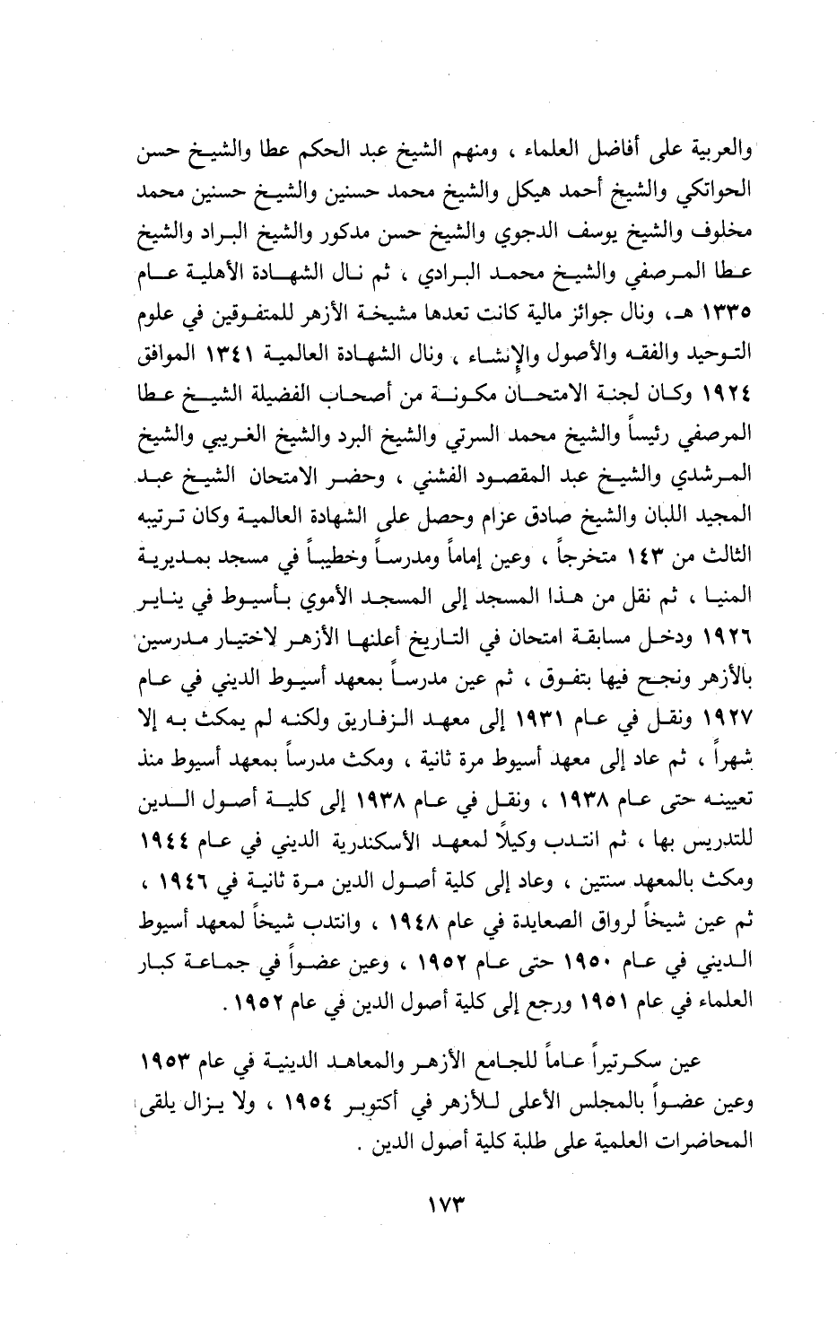 والعربية على أفاضل العلماء، ومنهم الشيخ عبد الحكم عطا والشيخ حسن الحواتكي والشيخ أحمد هيكل والشيخ محمد حسنين والشيخ حسنين محمد مخلوف والشيخ يوسف الدجوي والشيخ حسن مدكور والشيخ البراد والشيخ عطا المرصفي والشيخ محمد البرادي، ثم نال الشهادة الأهلية عام 1335 ه، ونال جوائز مالية كانت تعدها مشيخة الأزهر للمتفوقين في علوم التوحيد والفقه والأصول والإنشاء، ونال الشهادة العالمية 1341 الموافق 1924 وكان لجنة الامتحان مكونة من أصحاب الفضيلة الشيخ عطا المرصفي رئيسا والشيخ محمد السرتي والشيخ البرد والشيخ الغريبي والشيخ المرشدي والشيخ عبد المقصود الفشني، وحضر الامتحان الشيخ عبد المجيد اللبان والشيخ صادق عزام وحصل على الشهادة العالمية وكان ترتيبه الثالث من 143 متخرجا، وعين إماما ومدرسا وخطيبا في مسجد بمديرية المنيا، ثم نقل من هذا المسجد إلى المسجد الأموي بأسيوط في يناير 1926 ودخل مسابقة امتحان في التاريخ أعلنها الأزهر لاختيار مدرسين بالأزهر ونجح فيها بتفوق، ثم عين مدرسا بمعهد أسيوط الديني في عام 1927 ونقل في عام 1931 إلى معهد الزفاريق ولكنه لم يمكث به إلا شهرا، ثم عاد إلى معهد أسيوط مرة ثانية، ومكث مدرسا بمعهد أسيوط منذ تعيينه حتى عام 1938، ونقل في عام 1938 إلى كلية أصول الدين للتدريس بها، ثم انتدب وكيلا لمعهد الأسكندرية الديني في عام 1944 ومكث بالمعهد سنتين، وعاد إلى كلية أصول الدين مرة ثانية في 1946، ثم عين شيخا لرواق الصعايدة في عام 1948، وانتدب شيخا لمعهد أسيوط الديني في عام 1950 حتى عام 1952، وعين عضوا في جماعة كبار العلماء في عام 1951 ورجع إلى كلية أصول الدين في عام 1952.
