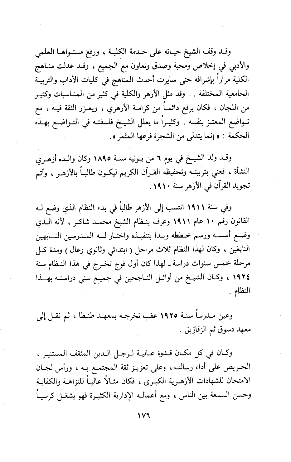 وقد وقف الشيخ حياته على خدمة الكلية، ورفع مستواها العلمي والأدبي في إخلاص ومحبة وصدق وتعاون مع الجميع، وقد عدلت مناهج الكلية مرارا بإشرافه حتى سايرت أحدث المناهج في كليات الآداب والتربية الجامعية المختلفة. . وقد مثل الأزهر والكلية في كثير من المناسبات وكثير من اللجان، فكان يرفع دائما من كرامة الأزهري، ويعزز الثقة فيه، مع تواضع المعتز بنفسه. وكثيرا ما يعلل الشيخ فلسفته في التواضع بهذه الحكمة: «إنما يتدلى من الشجرة فرعها المثمر».