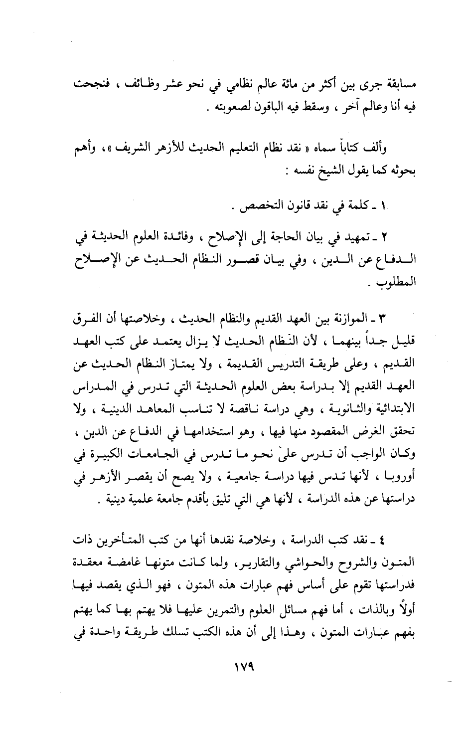 4 - نقد كتب الدراسة، وخلاصة نقدها أنها من كتب المتأخرين ذات المتون والشروح والحواشي والتقارير، ولما كانت متونها غامضة معقدة فدراستها تقوم على أساس فهم عبارات هذه المتون، فهو الذي يقصد فيها أولا وبالذات، أما فهم مسائل العلوم والتمرين عليها فلا يهتم بها كما يهتم بفهم عبارات المتون، وهذا إلى أن هذه الكتب تسلك طريقة واحدة في