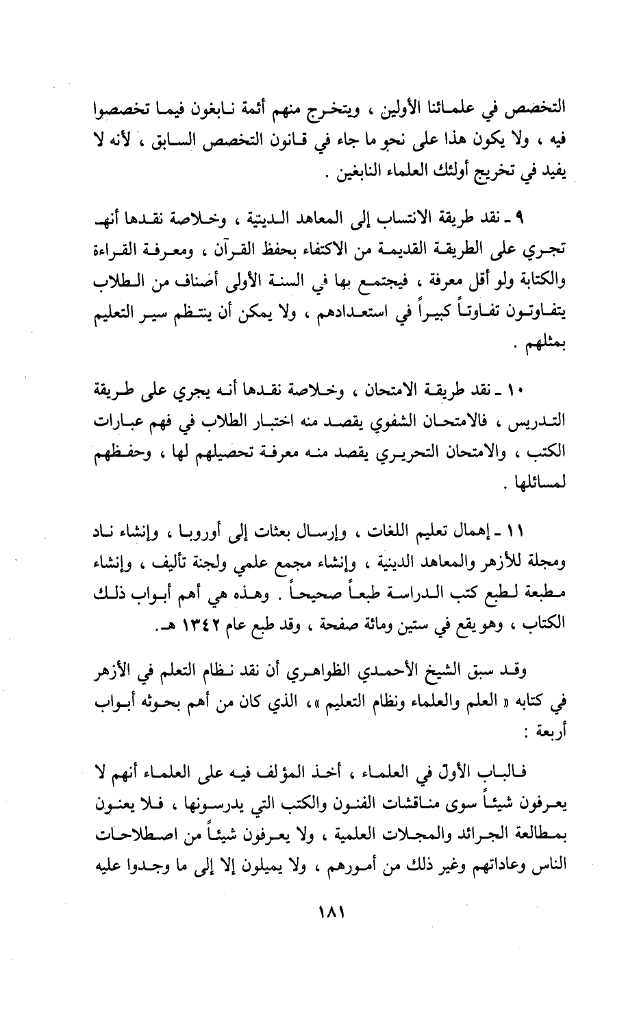 11 - إهمال تعليم اللغات، وإرسال بعثات إلى أوروبا، وإنشاء ناد ومجلة للأزهر والمعاهد الدينية، وإنشاء مجمع علمي ولجنة تأليف، وإنشاء مطبعة لطبع كتب الدراسة طبعا صحيحا. وهذه هي أهم أبواب ذلك الكتاب، وهو يقع في ستين ومائة صفحة، وقد طبع عام 1342 ه.