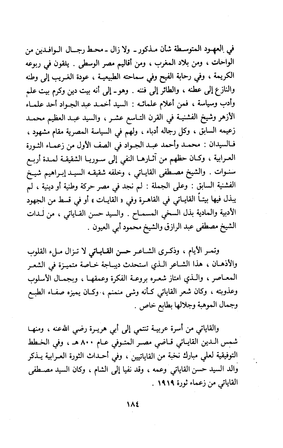 في العهود المتوسطة شأن مذكور-و لا زال-محط رجال الوافدين من الواحات، ومن بلاد المغرب، ومن أقاليم مصر الوسطى. يلقون في ربوعه الكريمة، وفي رحابة الفيح وفي سماحته الطبيعية، عودة الغريب إلى وطنه والنازع إلى عطنه، والطائر إلى فننه. وهو-إلى أنه بيت دين وكرم بيت علم وأدب وسياسة، فمن أعلام علمائه: السيد أحمد عبد الجواد أحد علماء الأزهر وشيخ الفشنية في القرن التاسع عشر، والسيد عبد العظيم محمد زعيمه السابق، وكل رجاله أدباء، ولهم في السياسة المصرية مقام مشهود، فالسيدان: محمد وأحمد عبد الجواد في الصف الأول من زعماء الثورة العرابية، وكان حظهم من آثارها النفي إلى سوريا الشقيقة لمدة أربع سنوات. والشيخ مصطفى القاياتي، وخلفه شقيقه السيد إبراهيم شيخ الفشنية السابق: وعلى الجملة: لم نجد في مصر حركة وطنية أو دينية، لم يبذل فيها بيتا القاياتي في القاهرة وفي «القايات» أو في قسط من الجهود الأدبية والمادية بذل السخي المسماح. والسيد حسن القاياتي، من لدات الشيخ مصطفى عبد الرازق والشيخ محمود أبي العيون.