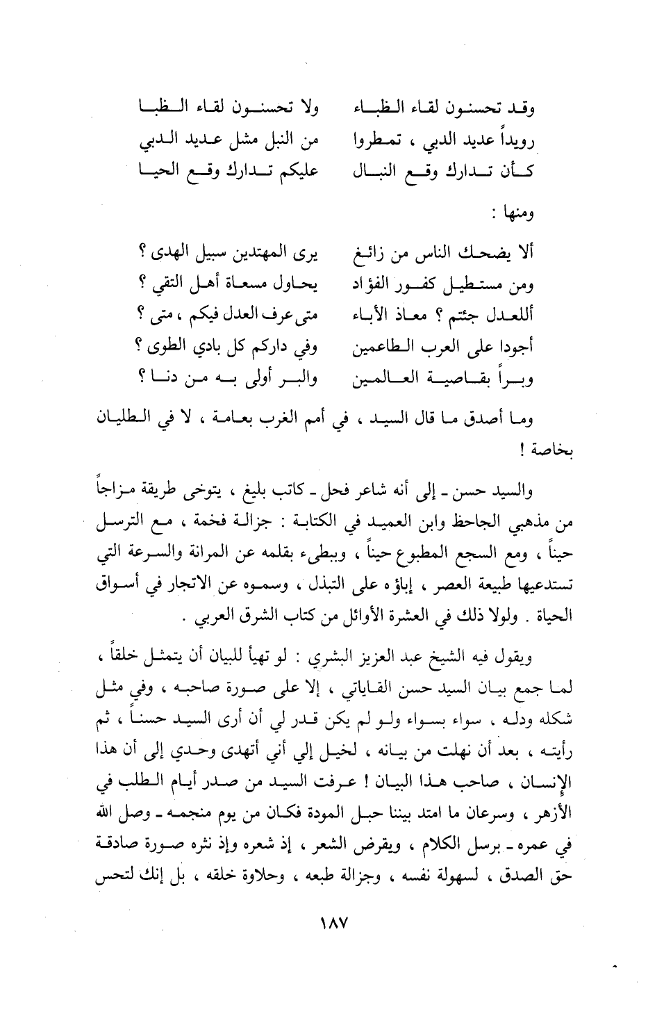 ويقول فيه الشيخ عبد العزيز البشري: لو تهيأ للبيان أن يتمثل خلقا، لما جمع بيان السيد حسن القاياتي، إلا على صورة صاحبه، وفي مثل شكله ودله، سواء بسواء ولو لم يكن قدر لي أن أرى السيد حسنا، ثم رأيته، بعد أن نهلت من بيانه، لخيل إلى أني أتهدى وحدي إلى أن هذا الإنسان، صاحب هذا البيان! عرفت السيد من صدر أيام الطلب في الأزهر، وسرعان ما امتد بيننا حبل المودة فكان من يوم منجمه-وصل اللّه في عمره-برسل الكلام، ويقرض الشعر، إذ شعره وإذ نثره صورة صادقة حق الصدق، لسهولة نفسه، وجزالة طبعه، وحلاوة خلقه، بل إنك لتحس