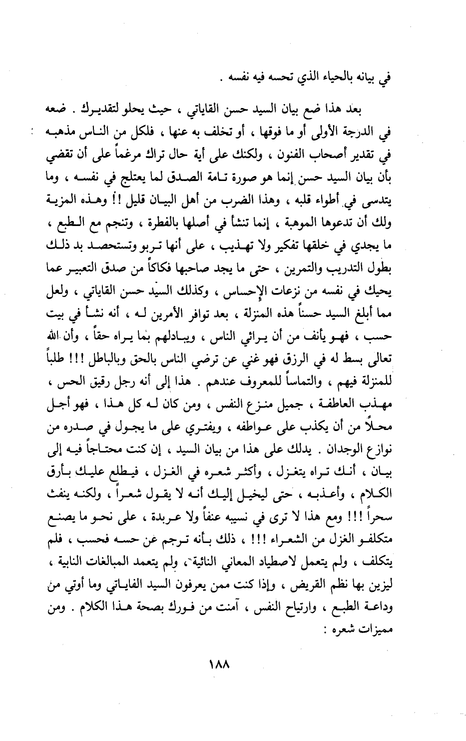 بعد هذا ضع بيان السيد حسن القاياتي، حيث يحلو لتقديرك. ضعه في الدرجة الأولى أو ما فوقها، أو تخلف به عنها، فلكل من الناس مذهبه في تقدير أصحاب الفنون، ولكنك على أية حال تراك مرغما على أن تقضي بأن بيان السيد حسن إنما هو صورة تامة الصدق لما يعتلج في نفسه، وما يتدسى في أطواء قلبه، وهذا الضرب من أهل البيان قليل!! وهذه المزية ولك أن تدعوها الموهبة، إنما تنشأ في أصلها بالفطرة، وتنجم مع الطبع، ما يجدي في خلقها تفكير ولا تهذيب، على أنها تربو وتستحصد بد ذلك بطول التدريب والتمرين، حتى ما يجد صاحبها فكاكا من صدق التعبير عما يحيك في نفسه من نزعات الإحساس، وكذلك السيد حسن القاياتي، ولعل مما أبلغ السيد حسنا هذه المنزلة، بعد توافر الأمرين له، أنه نشأ في بيت حسب، فهو يأنف من أن يرائي الناس، ويبادلهم بما يراه حقا، وأن اللّه تعالى بسط له في الرزق فهو غني عن ترضي الناس بالحق وبالباطل!!! طلبا للمنزلة فيهم، والتماسا للمعروف عندهم. هذا إلى أنه رجل رقيق الحس، مهذب العاطفة، جميل منزع النفس، ومن كان له كل هذا، فهو أجل محلا من أن يكذب على عواطفه، ويفتري على ما يجول في صدره من نوازع الوجدان. يدلك على هذا من بيان السيد، إن كنت محتاجا فيه إلى بيان، أنك تراه يتغزل، وأكثر شعره في الغزل، فيطلع عليك بأرق الكلام، وأعذبه، حتى ليخيل إليك أنه لا يقول شعرا، ولكنه ينفث سحرا!!! ومع هذا لا ترى في نسيبه عنفا ولا عربدة، على نحو ما يصنع متكلفو الغزل من الشعراء!!!، ذلك بأنه ترجم عن حسه فحسب، فلم يتكلف، ولم يتعمل لاصطياد المعاني النائية، ولم يتعمد المبالغات النابية، ليزين بها نظم القريض، وإذا كنت ممن يعرفون السيد القاياتي وما أوتي من وداعة الطبع، وارتياح النفس، آمنت من فورك بصحة هذا الكلام. ومن مميزات شعره: