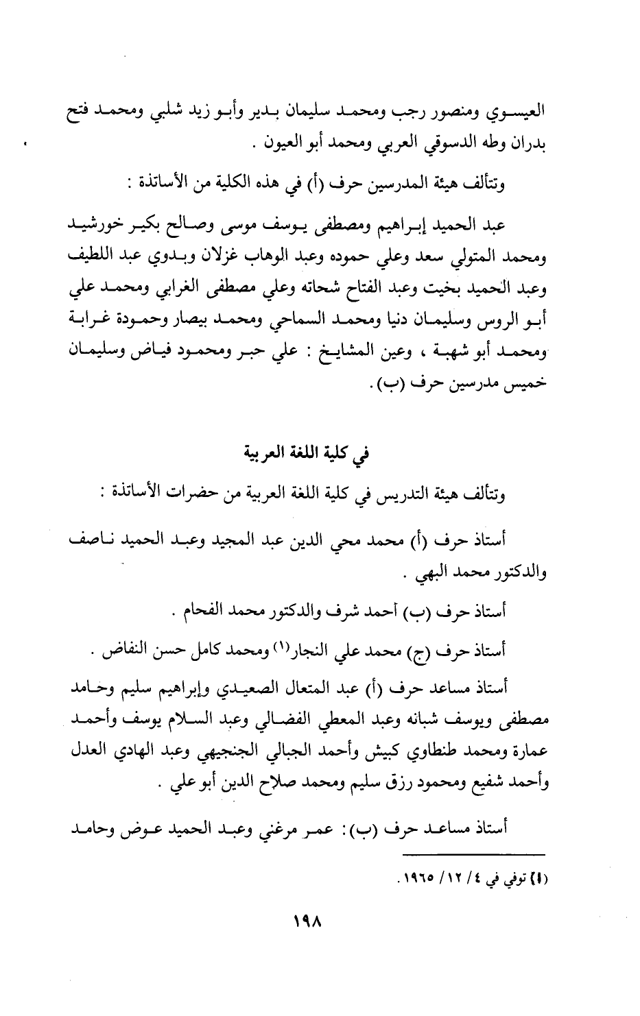 أستاذ مساعد حرف (أ) عبد المتعال الصعيدي وإبراهيم سليم وحامد مصطفى ويوسف شبانه وعبد المعطي الفضالي وعبد السلام يوسف وأحمد عمارة ومحمد طنطاوي كبيش وأحمد الجبالي الجنجيهي وعبد الهادي العدل وأحمد شفيع ومحمود رزق سليم ومحمد صلاح الدين أبو علي.