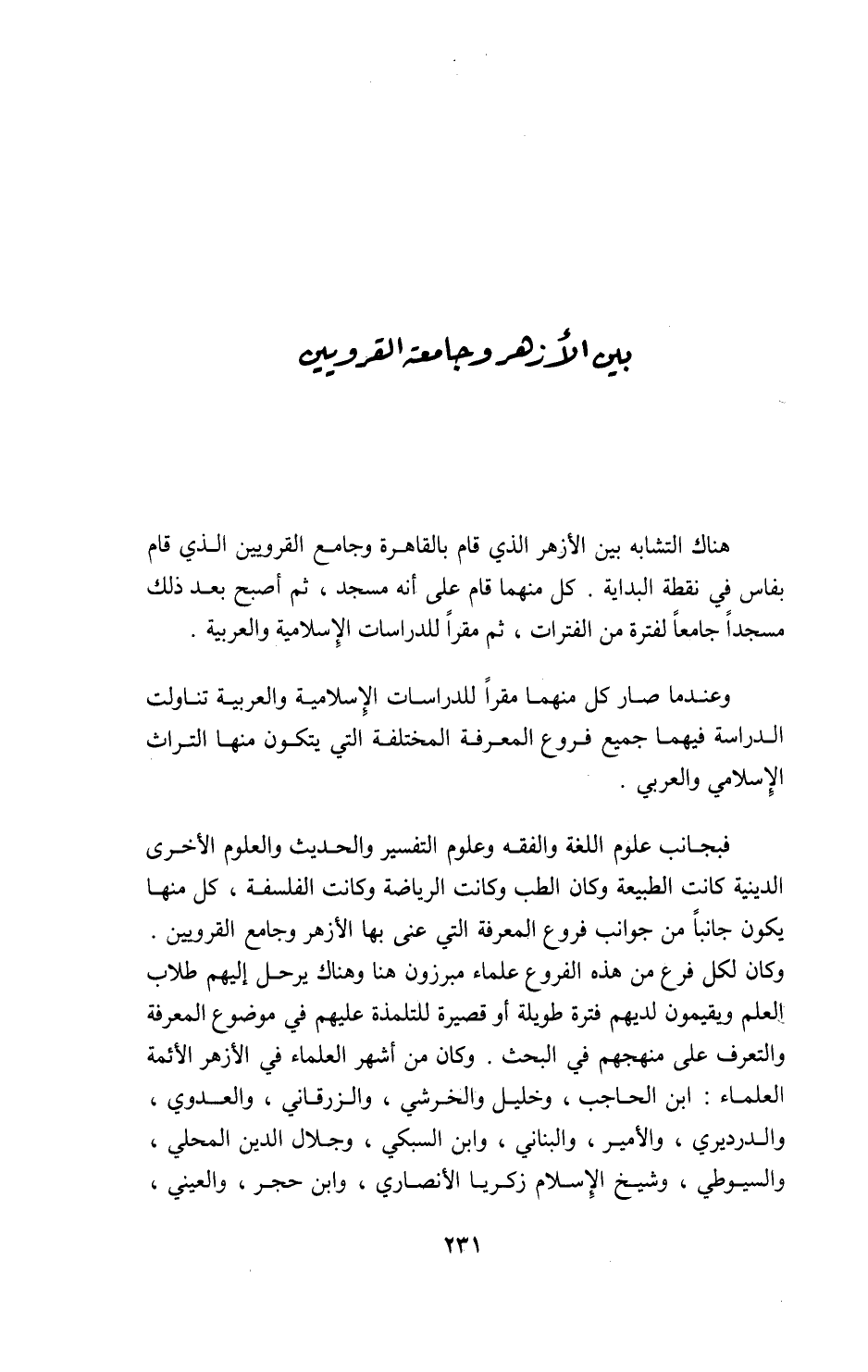 فبجانب علوم اللغة والفقه وعلوم التفسير والحديث والعلوم الأخرى الدينية كانت الطبيعة وكان الطب وكانت الرياضة وكانت الفلسفة، كل منها يكون جانبا من جوانب فروع المعرفة التي عنى بها الأزهر وجامع القرويين.