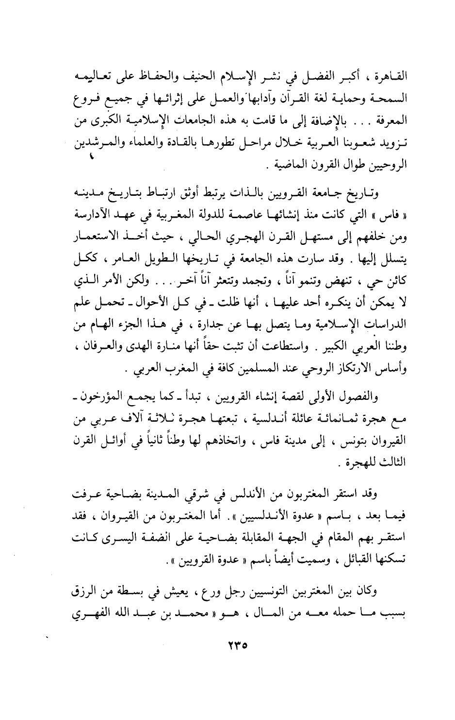 وتاريخ جامعة القرويين بالذات يرتبط أوثق ارتباط بتاريخ مدينه «فاس» التي كانت منذ إنشائها عاصمة للدولة المغربية في عهد الآدارسة ومن خلفهم إلى مستهل القرن الهجري الحالي، حيث أخذ الاستعمار يتسلل إليها. وقد سارت هذه الجامعة في تاريخها الطويل العامر، ككل كائن حي، تنهض وتنمو آنا، وتجمد وتتعثر آنا آخر. . . ولكن الأمر الذي لا يمكن أن ينكره أحد عليها، أنها ظلت-في كل الأحوال-تحمل علم الدراسات الإسلامية وما يتصل بها عن جدارة، في هذا الجزء الهام من وطننا العربي الكبير. واستطاعت أن تثبت حقا أنها منارة الهدى والعرفان، وأساس الارتكاز الروحي عند المسلمين كافة في المغرب العربي.