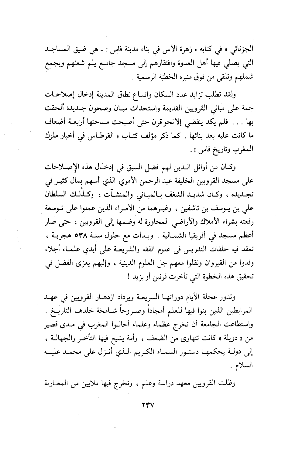 وكان من أوائل الذين لهم فضل السبق في إدخال هذه الإصلاحات على مسجد القرويين الخليفة عبد الرحمن الأموي الذي أسهم بمال كثير في تجديده، وكان شديد الشغف بالمباني والمنشآت، وكذلك السلطان علي بن يوسف بن تاشفين، وغيرهما من الأمراء الذين عملوا على توسعة رقعته بشراء الأملاك والأراضي المجاورة له وضمها إلى القرويين، حتى صار أعظم مسجد في أفريقيا الشمالية. وبدأت مع حلول سنة 538 هجرية، تعقد فيه حلقات التدريس في علوم الفقه والشريعة على أيدي علماء أجلاء وفدوا من القيروان ونقلوا معهم جل العلوم الدينية، وإليهم يعزى الفضل في تحقيق هذه الخطوة التي تأخرت قرنين أو يزيد!