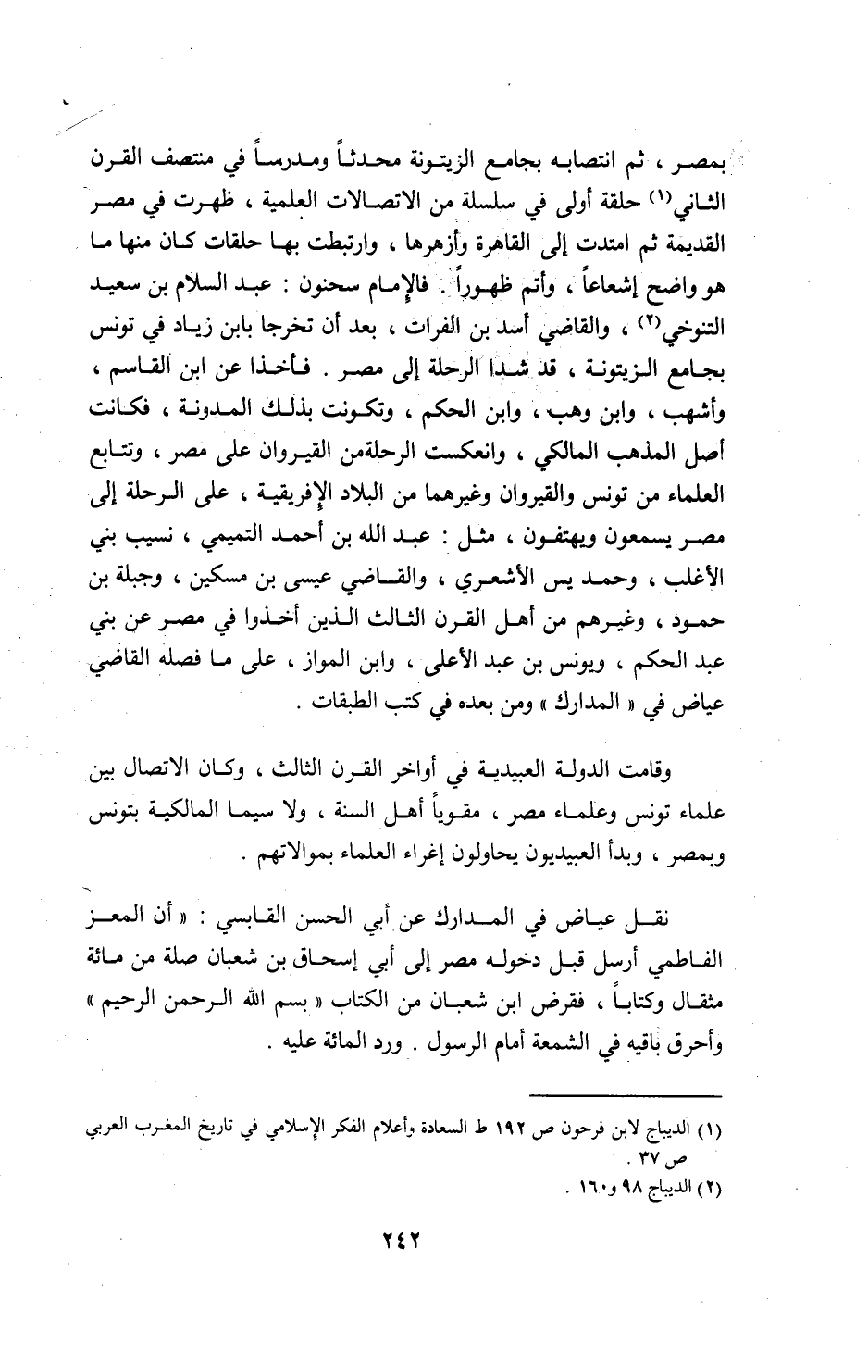 بمصر، ثم انتصابه بجامع الزيتونة محدثا ومدرسا في منتصف القرن الثاني 1حلقة أولى في سلسلة من الاتصالات العلمية، ظهرت في مصر القديمة ثم امتدت إلى القاهرة وأزهرها، وارتبطت بها حلقات كان منها ما هو واضح إشعاعا، وأتم ظهورا. فالإمام سحنون: عبد السلام بن سعيد التنوخي 2، والقاضي أسد بن الفرات، بعد أن تخرجا بابن زياد في تونس بجامع الزيتونة، قد شدا الرحلة إلى مصر. فأخذا عن ابن القاسم، وأشهب، وابن وهب، وابن الحكم، وتكونت بذلك المدونة، فكانت أصل المذهب المالكي، وانعكست الرحلة من القيروان على مصر، وتتابع العلماء من تونس والقيروان وغيرهما من البلاد الإفريقية، على الرحلة إلى مصر يسمعون ويهتفون، مثل: عبد الله بن أحمد التميمي، نسيب بني الأغلب، وحمد يس الأشعري، والقاضي عيسى بن مسكين، وجبلة بن حمود، وغيرهم من أهل القرن الثالث الذين أخذوا في مصر عن بني عبد الحكم، ويونس بن عبد الأعلى، وابن المواز، على ما فصله القاضي عياض في «المدارك» ومن بعده في كتب الطبقات.