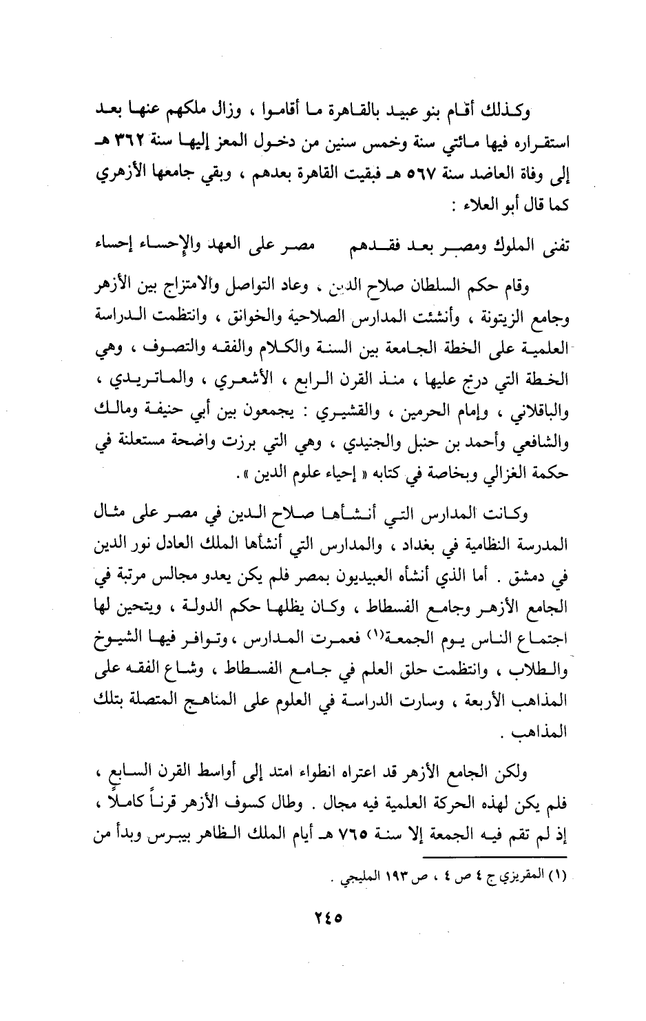 وكذلك أقام بنو عبيد بالقاهرة ما أقاموا، وزال ملكهم عنها بعد استقراره فيها مائتي سنة وخمس سنين من دخول المعز إليها سنة 362 ه إلى وفاة العاضد سنة 567 ه فبقيت القاهرة بعدهم، وبقي جامعها الأزهري كما قال أبو العلاء: