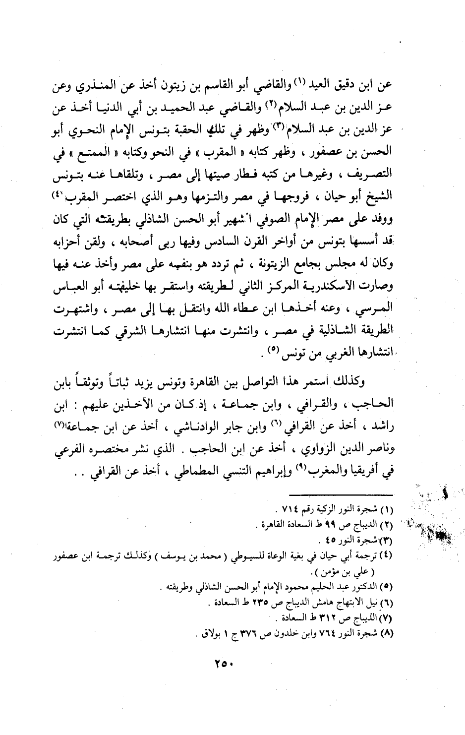 عن ابن دقيق العيد 1و القاضي أبو القاسم بن زيتون أخذ عن المنذري وعن عز الدين بن عبد السلام 2 والقاضي عبد الحميد بن أبي الدنيا أخذ عن عز الدين بن عبد السلام 3و ظهر في تلك الحقبة بتونس الإمام النحوي أبو الحسن بن عصفور، وظهر كتابه «المقرب» في النحو وكتابه «الممتع» في التصريف، وغيرها من كتبه فطار صيتها إلى مصر، وتلقاها عنه بتونس الشيخ أبو حيان، فروجها في مصر والتزمها وهو الذي اختصر المقرب 4 ووفد على مصر الإمام الصوفي الشهير أبو الحسن الشاذلي بطريقته التي كان قد أسسها بتونس من أواخر القرن السادس وفيها ربى أصحابه، ولقن أحزابه وكان له مجلس بجامع الزيتونة، ثم تردد هو بنفسه على مصر وأخذ عنه فيها وصارت الأسكندرية المركز الثاني لطريقته واستقر بها خليفته أبو العباس المرسي، وعنه أخذها ابن عطاء الله وانتقل بها إلى مصر، واشتهرت الطريقة الشاذلية في مصر، وانتشرت منها انتشارها الشرقي كما انتشرت انتشارها الغربي من تونس 5.