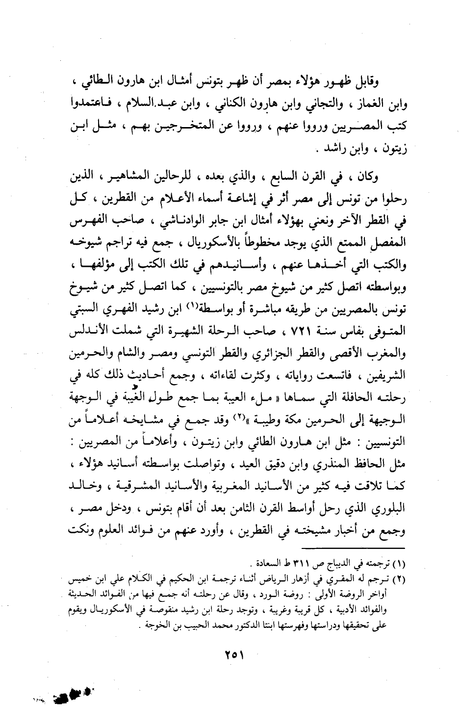 وكان، في القرن السابع، والذي بعده، للرحالين المشاهير، الذين رحلوا من تونس إلى مصر أثر في إشاعة أسماء الأعلام من القطرين، كل في القطر الآخر ونعني بهؤلاء أمثال ابن جابر الوادناشي، صاحب الفهرس المفصل الممتع الذي يوجد مخطوطا بالأسكوريال، جمع فيه تراجم شيوخه والكتب التي أخذها عنهم، وأسانيدهم في تلك الكتب إلى مؤلفها، وبواسطته اتصل كثير من شيوخ مصر بالتونسيين، كما اتصل كثير من شيوخ تونس بالمصريين من طريقه مباشرة أو بواسطة 1 ابن رشيد الفهري السبتي المتوفى بفاس سنة 721، صاحب الرحلة الشهيرة التي شملت الأندلس والمغرب الأقصى والقطر الجزائري والقطر التونسي ومصر والشام والحرمين الشريفين، فاتسعت رواياته، وكثرت لقاءاته، وجمع أحاديث ذلك كله في رحلته الحافلة التي سماها «ملء العيبة بما جمع طول الغيبة في الوجهة الوجيهة إلى الحرمين مكة وطيبة» 2و قد جمع في مشايخه أعلاما من التونسيين: مثل ابن هارون الطائي وابن زيتون، وأعلاما من المصريين: