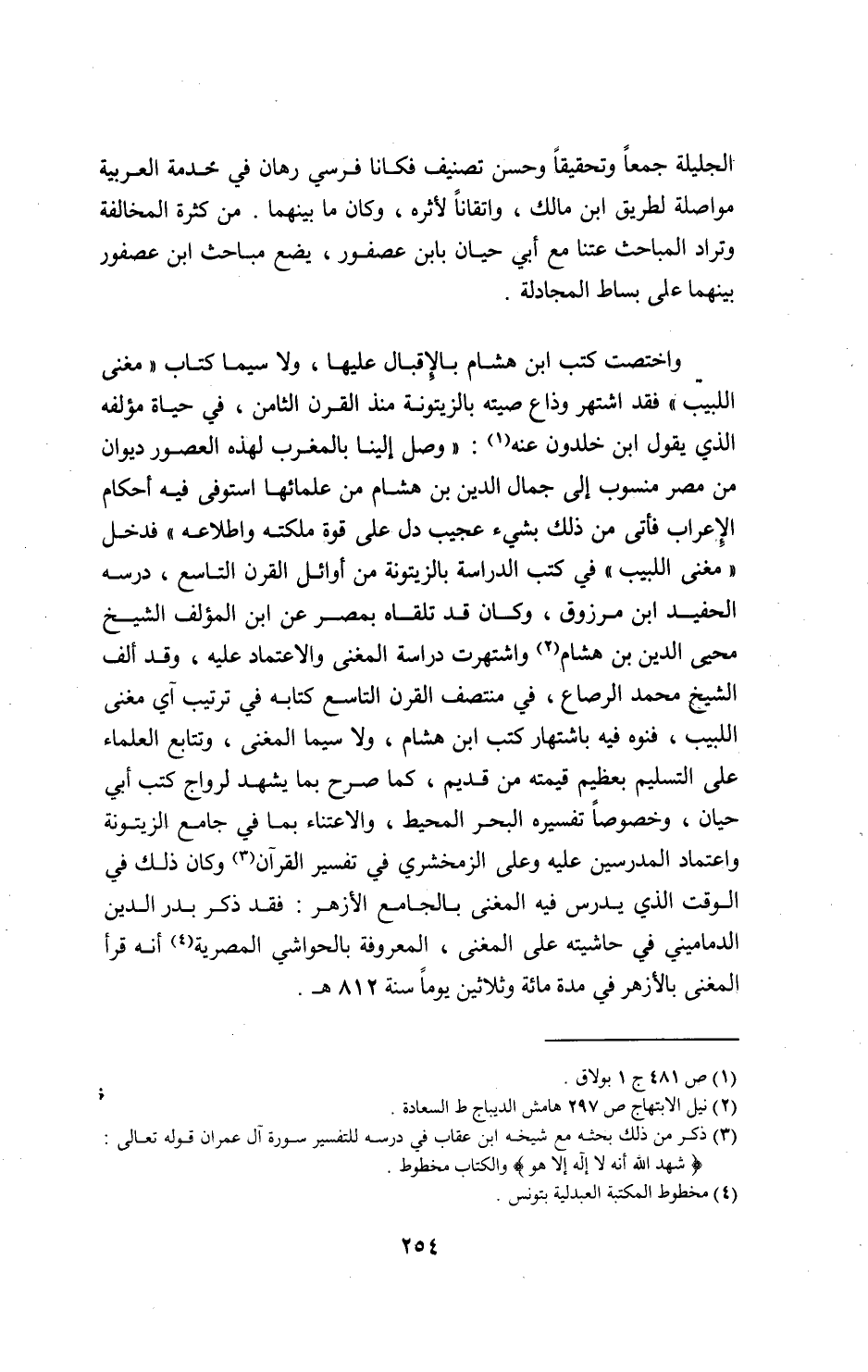 واختصت كتب ابن هشام بالإقبال عليها، ولا سيما كتاب «مغنى اللبيب» فقد اشتهر وذاع صيته بالزيتونة منذ القرن الثامن، في حياة مؤلفه الذي يقول ابن خلدون عنه 1: «وصل إلينا بالمغرب لهذه العصور ديوان من مصر منسوب إلى جمال الدين بن هشام من علمائها استوفى فيه أحكام الإعراب فأتى من ذلك بشيء عجيب دل على قوة ملكته واطلاعه» فدخل «مغنى اللبيب» في كتب الدراسة بالزيتونة من أوائل القرن التاسع، درسه الحفيد ابن مرزوق، وكان قد تلقاه بمصر عن ابن المؤلف الشيخ محيى الدين بن هشام 2 واشتهرت دراسة المغنى والاعتماد عليه، وقد ألف الشيخ محمد الرصاع، في منتصف القرن التاسع كتابه في ترتيب آي مغنى اللبيب، فنوه فيه باشتهار كتب ابن هشام، ولا سيما المغنى، وتتابع العلماء على التسليم بعظيم قيمته من قديم، كما صرح بما يشهد لرواج كتب أبي حيان، وخصوصا تفسيره البحر المحيط، والاعتناء بما في جامع الزيتونة واعتماد المدرسين عليه وعلى الزمخشري في تفسير القرآن 3و كان ذلك في الوقت الذي يدرس فيه المغنى بالجامع الأزهر: فقد ذكر بدر الدين الدماميني في حاشيته على المغنى، المعروفة بالحواشي المصرية 4 أنه قرأ المغنى بالأزهر في مدة مائة وثلاثين يوما سنة 812 ه.
