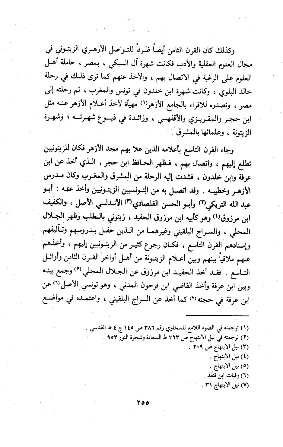 وجاء القرن التاسع بأعلامه الذين علا بهم مجد الأزهر فكان للزيتونيين تطلع إليهم، واتصال بهم، فظهر الحافظ ابن حجر، الذي أخذ عن ابن عرفة وابن خلدون، فشدت إليه الرحلة من المشرق والمغرب وكان مدرس الأزهر وخطيبه. وقد اتصل به من التونسيين الزيتونيين وأخذ عنه: أبو عبد الله التريكي 2 وأبو الحسن القلصادي 3الأندلسي الأصل، والكفيف ابن مرزوق 4 وهو كأبيه ابن مرزوق الحفيد، زيتوني بالطلب وظهر الجلال المحلي، والسراج البلقيني وغيرهما من الذين حفل بدروسهم وتآليفهم وإسنادهم القرن التاسع، فكان رجوع كثير من الزيتونيين إليهم، وأخذهم عنهم ملاقيا بينهم وبين أعلام الزيتونة من أهل أواخر القرن الثامن وأوائل التاسع. فقد أخذ الحفيد ابن مرزوق عن الجلال المحلي 5و جمع بينه وبين ابن عرفة وأخذ القاضي ابن فرحون المدني، وهو تونسي الأصل 6 عن ابن عرفة في حجته 7كما أخذ عن السراج البلقيني، واعتمده في مواضع