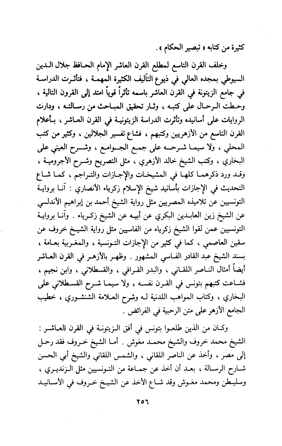 وخلف القرن التاسع لمطلع القرن العاشر الإمام الحافظ جلال الدين السيوطي بمجده العالي في ذيوع التآليف الكثيرة المهمة، فتأثرت الدراسة في جامع الزيتونة في القرن العاشر باسمه تأثرا قويا امتد إلى القرون التالية، وحطت الرحال على كتبه، وثار تحقيق المباحث من رسالته، ودارت الروايات على أسانيده وتأثرت الدراسة الزيتونية في القرن العاشر، بأعلام القرن التاسع من الأزهريين وكتبهم، فشاع تفسير الجلالين، وكثير من كتب المحلي، ولا سيما شرحه على جمع الجوامع، وشرح العيني على البخاري، وكتب الشيخ خالد الأزهري، مثل التصريح وشرح الأجرومية، وقد ورد ذكرهما كلها في المشيخات والإجازات والتراجم، كما شاع التحديث في الإجازات بأسانيد شيخ الإسلام زكرياء الأنصاري: آنا برواية التونسيين عن تلاميذه المصريين مثل رواية الشيخ أحمد بن إبراهيم الأندلسي عن الشيخ زين العابدين البكري عن أبيه عن الشيخ زكرياء. وآنا برواية التونسيين عمن لقوا الشيخ زكرياء من الفاسيين مثل رواية الشيخ خروف عن سقين العاصمي، كما في كثير من الإجازات التونسية، والمغربية بعامة، بسند الشيخ عبد القادر الفاسي المشهور. وظهر بالأزهر في القرن العاشر أيضا أمثال الناصر اللقاني، والبدر القرافي، والقسطلاني، وابن نجيم، فشاعت كتبهم بتونس في القرن نفسه، ولا سيما شرح القسطلاني على البخاري، وكتاب المواهب اللدنية له وشرح العلامة الشنشوري، خطيب الجامع الأزهر على متن الرحبية في الفرائض.