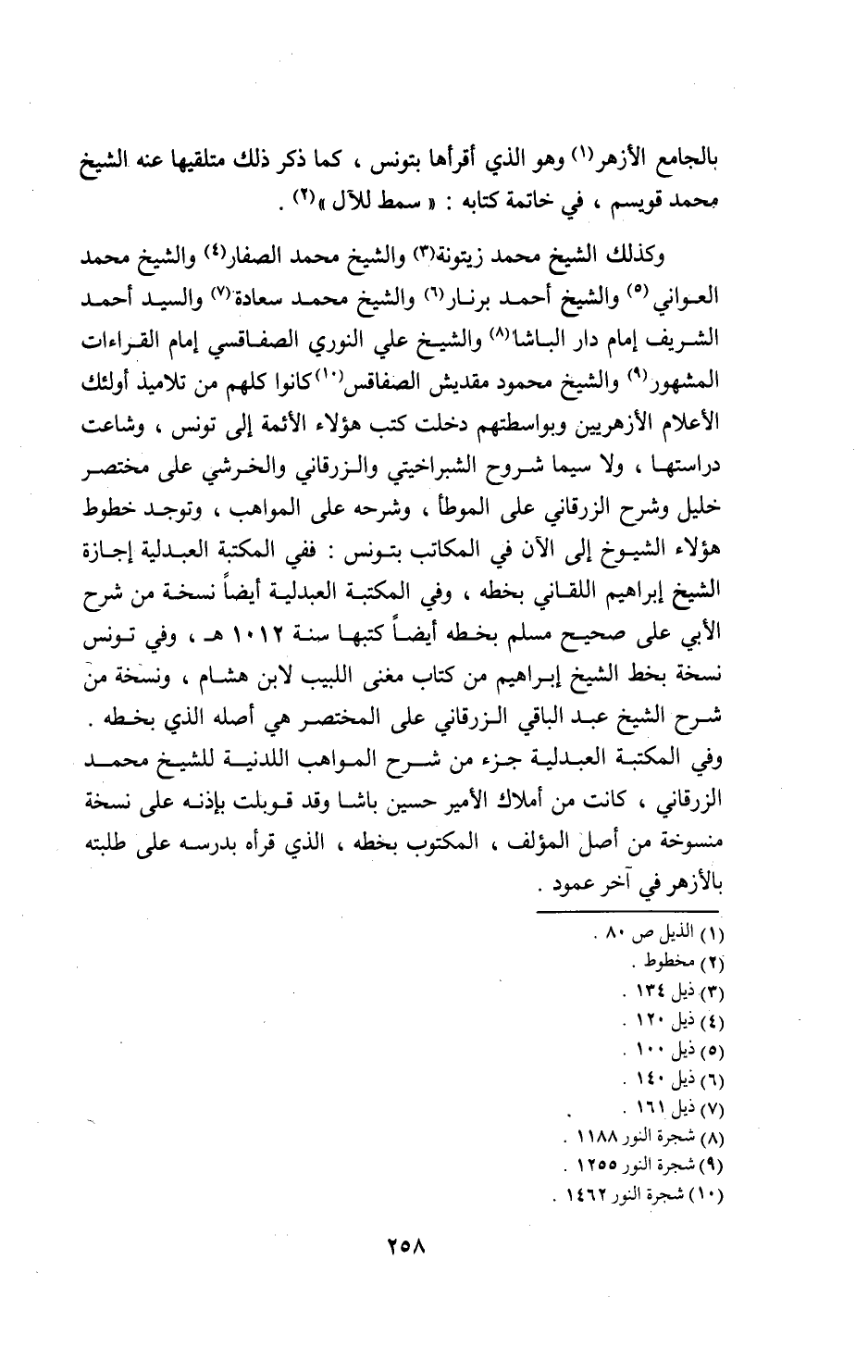 وكذلك الشيخ محمد زيتونة 3و الشيخ محمد الصفار 4 والشيخ محمد العواني 5و الشيخ أحمد برنار 6 والشيخ محمد سعادة 7و السيد أحمد الشريف إمام دار الباشا 8 والشيخ علي النوري الصفاقسي إمام القراءات المشهور 9و الشيخ محمود مقديش الصفاقس 10 كانوا كلهم من تلاميذ أولئك الأعلام الأزهريين وبواسطتهم دخلت كتب هؤلاء الأئمة إلى تونس، وشاعت دراستها، ولا سيما شروح الشبراخيتي والزرقاني والخرشي على مختصر خليل وشرح الزرقاني على الموطأ، وشرحه على المواهب، وتوجد خطوط هؤلاء الشيوخ إلى الآن في المكاتب بتونس: ففي المكتبة العبدلية إجازة الشيخ إبراهيم اللقاني بخطه، وفي المكتبة العبدلية أيضا نسخة من شرح الأبي على صحيح مسلم بخطه أيضا كتبها سنة 1012 ه، وفي تونس نسخة بخط الشيخ إبراهيم من كتاب مغنى اللبيب لابن هشام، ونسخة من شرح الشيخ عبد الباقي الزرقاني على المختصر هي أصله الذي بخطه.