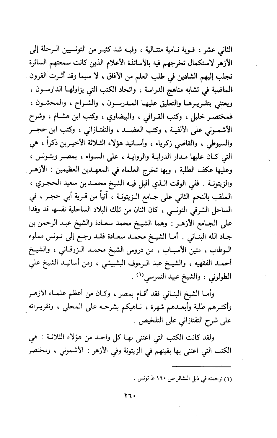الثاني عشر، قوية نامية متتالية، وفيه شد كثير من التونسيين الرحلة إلى الأزهر لاستكمال تخرجهم فيه بالأساتذة الأعلام الذين كانت سمعتهم السائرة تجلب إليهم الشادين في طلب العلم من الآفاق، لا سيما وقد أثرت القرون الماضية في تشابه مناهج الدراسة، واتحاد الكتب التي يزاولها الدارسون، ويعتني بتقريرها والتعليق عليها المدرسون، والشراح، والمحشون، فمختصر خليل، وكتب القرافي، والبيضاوي، وكتب ابن هشام، وشرح الأشموني على الألفية، وكتب العضد، والتفتازاني، وكتب ابن حجر والسيوطي، والقاضي زكرياء، وأسانيد هؤلاء الثلاثة الأخيرين ذكرا، هي التي كان عليها مدار الدراية والرواية، على السواء، بمصر وبتونس، وعليها عكف الطلبة، وبها تخرج العلماء في المعهدين العظيمين: الأزهر والزيتونة. ففي الوقت الذي أقبل فيه الشيخ محمد بن سعيد الحجري، الملقب بالنحم الثاني على جامع الزيتونة، آتيا من قرية أبي حجر، في الساحل الشرقي التونسي، كان اثنان من تلك البلاد الساحلية نفسها قد وفدا على الجامع الأزهر: وهما الشيخ محمد سعادة والشيخ عبد الرحمن بن جاد الله البناني. أما الشيخ محمد سعادة فقد رجع إلى تونس مملوء الوطاب، متين الأسباب، من دروس الشيخ محمد الزرقاني، والشيخ أحمد الفقهيه، والشيخ عبد الرءوف البشبيشي، ومن أسانيد الشيخ علي الطولوني، والشيخ عبيد النمرسي 1.