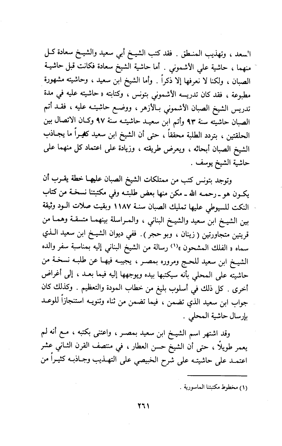 السعد، وتهذيب المنطق. فقد كتب الشيخ أبي سعيد والشيخ سعادة كل منهما، حاشية علي الأشموني. أما حاشية الشيخ سعادة فكانت قبل حاشية الصبان، ولكنا لا نعرفها إلا ذكرا. وأما الشيخ ابن سعيد، وحاشيته مشهورة مطبوعة، فقد كان تدريسه الأشموني بتونس، وكتابته «حاشيته عليه في مدة تدريس الشيخ الصبان الأشموني بالأزهر، ووضع حاشيته عليه، فقد أتم الصبان حاشيته سنة 93 وأتم ابن سعيد حاشيته سنة 97 وكان الاتصال بين الحلقتين، بتردد الطلبة محققا، حتى أن الشيخ ابن سعيد كثيرا ما يجاذب الشيخ الصبان أبحاثه، ويعرض طريقته، وزيادة على اعتماد كل منهما على حاشية الشيخ يوسف.