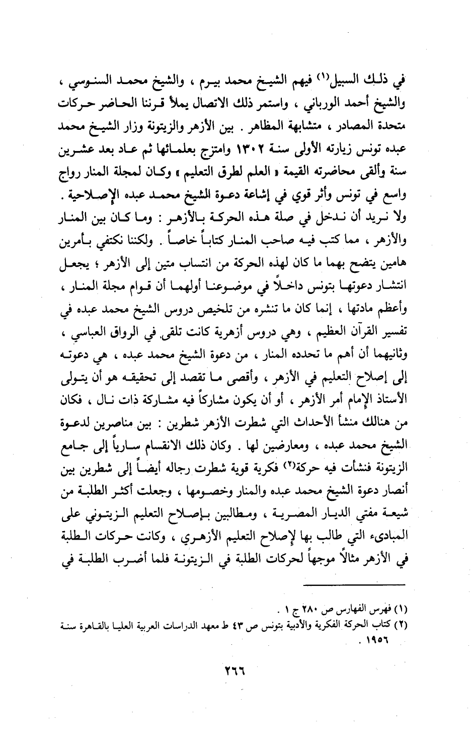 في ذلك السبيل 1 فيهم الشيخ محمد بيرم، والشيخ محمد السنوسي، والشيخ أحمد الورباني، واستمر ذلك الاتصال يملأ قرننا الحاضر حركات متحدة المصادر، متشابهة المظاهر. بين الأزهر والزيتونة وزار الشيخ محمد عبده تونس زيارته الأولى سنة 1302 وامتزج بعلمائها ثم عاد بعد عشرين سنة وألقى محاضرته القيمة «العلم لطرق التعليم» وكان لمجلة المنار رواج واسع في تونس وأثر قوي في إشاعة دعوة الشيخ محمد عبده الإصلاحية.
