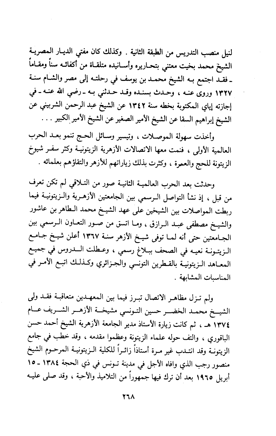 ولم تزل مظاهر الاتصال تبرز فيما بين المعهدين متعاقبة فقد ولى الشيخ محمد الخضر حسين التونسي مشيخة الأزهر الشريف عام 1374 ه، ثم كانت زيارة الأستاذ مدير الجامعة الأزهرية الشيخ أحمد حسن الباقوري، والتف حوله علماء الزيتونة وعظموا مقدمه، وقد خطب في جامع الزيتونة وقد انتدب غير مرة أستاذا زائرا للكلية الزيتونية المرحوم الشيخ منصور رجب الذي وافاه الأجل في مدينة تونس في ذي الحجة 1384 - 15 أبريل 1965 بعد أن ترك فيها جمهورا من التلاميذ والأحبة، وقد صلى عليه