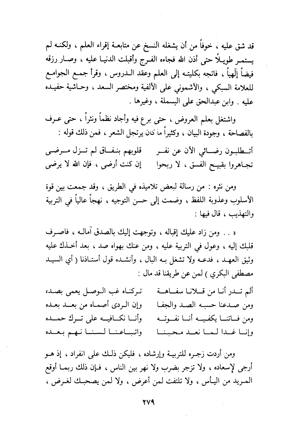 «. . ومن زاد عليك إقباله، وتوجهت إليك بالصدق آماله، فاصرف قلبك إليه، وعول في التربية عليه، ومن عنك بهواه صد، بعد أخذك عليه وثيق العهد، فدعه ولا تشغل به البال، وأنشده قول أستاذنا (أي السيد مصطفى البكري) لمن عن طريقنا قد مال: