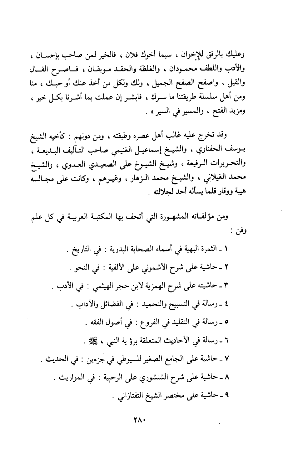 وعليك بالرفق للإخوان، سيما أخوك فلان، فالخير لمن صاحب بإحسان، والأدب واللطف محمودان، والغلظة والحقد موبقان، فاصرح القال والقيل، واصفح الصفح الجميل، ولك ولكل من أخذ عنك أو حبك، منا ومن أهل سلسلة طريقتنا ما سرك، فابشر إن عملت بما أشرنا بكل خير، ومزيد الفتح، والمسير في السير».
