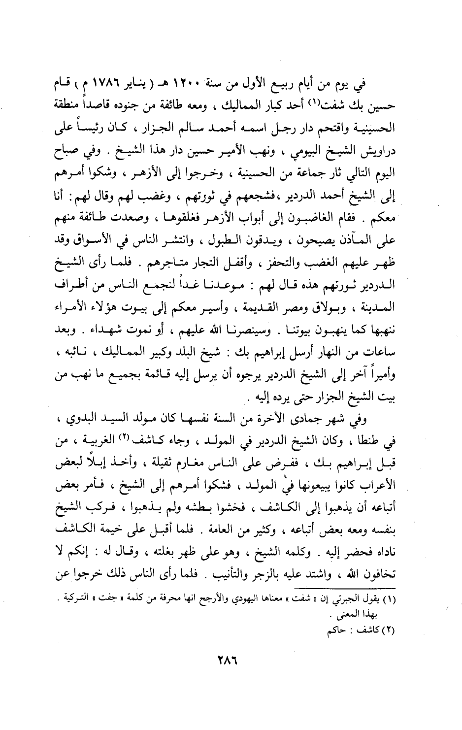 وفي شهر جمادى الآخرة من السنة نفسها كان مولد السيد البدوي، في طنطا، وكان الشيخ الدردير في المولد، وجاء كاشف 2 الغربية، من قبل إبراهيم بك، ففرض على الناس مغارم ثقيلة، وأخذ إبلا لبعض الأعراب كانوا يبيعونها في المولد، فشكوا أمرهم إلى الشيخ، فأمر بعض أتباعه أن يذهبوا إلى الكاشف، فخشوا بطشه ولم يذهبوا، فركب الشيخ بنفسه ومعه بعض أتباعه، وكثير من العامة. فلما أقبل على خيمة الكاشف ناداه فحضر إليه. وكلمه الشيخ، وهو على ظهر بغلته، وقال له: إنكم لا تخافون اللّه، واشتد عليه بالزجر والتأنيب. فلما رأى الناس ذلك خرجوا عن