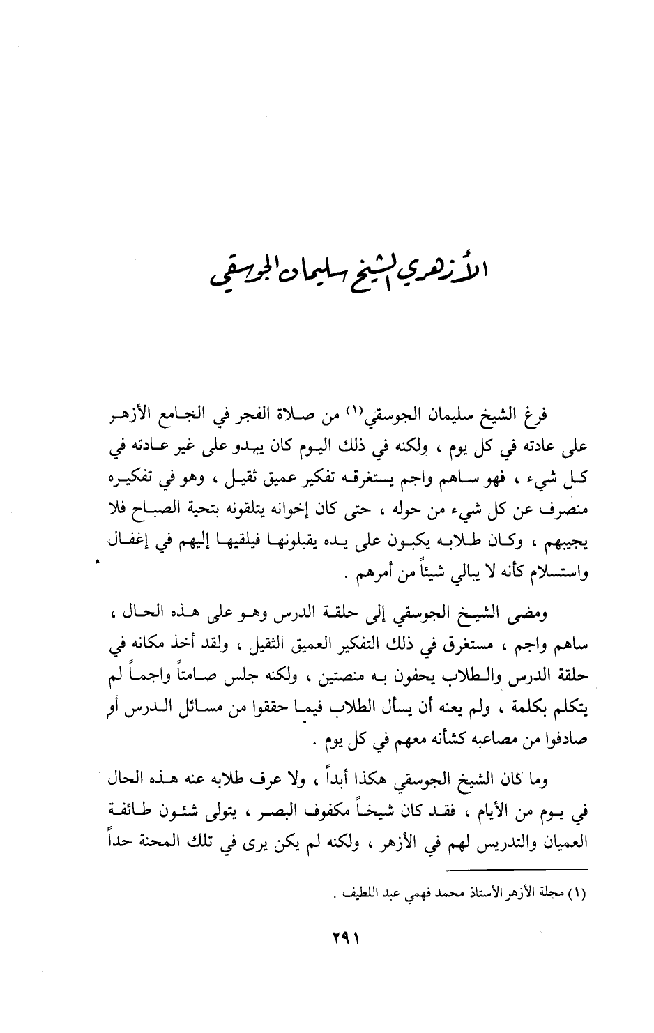 فرغ الشيخ سليمان الجوسقي 1 من صلاة الفجر في الجامع الأزهر على عادته في كل يوم، ولكنه في ذلك اليوم كان يبدو على غير عادته في كل شيء، فهو ساهم واجم يستغرقه تفكير عميق ثقيل، وهو في تفكيره منصرف عن كل شيء من حوله، حتى كان إخوانه يتلقونه بتحية الصباح فلا يجيبهم، وكان طلابه يكبون على يده يقبلونها فيلقيها إليهم في إغفال واستسلام كأنه لا يبالي شيئا من أمرهم.