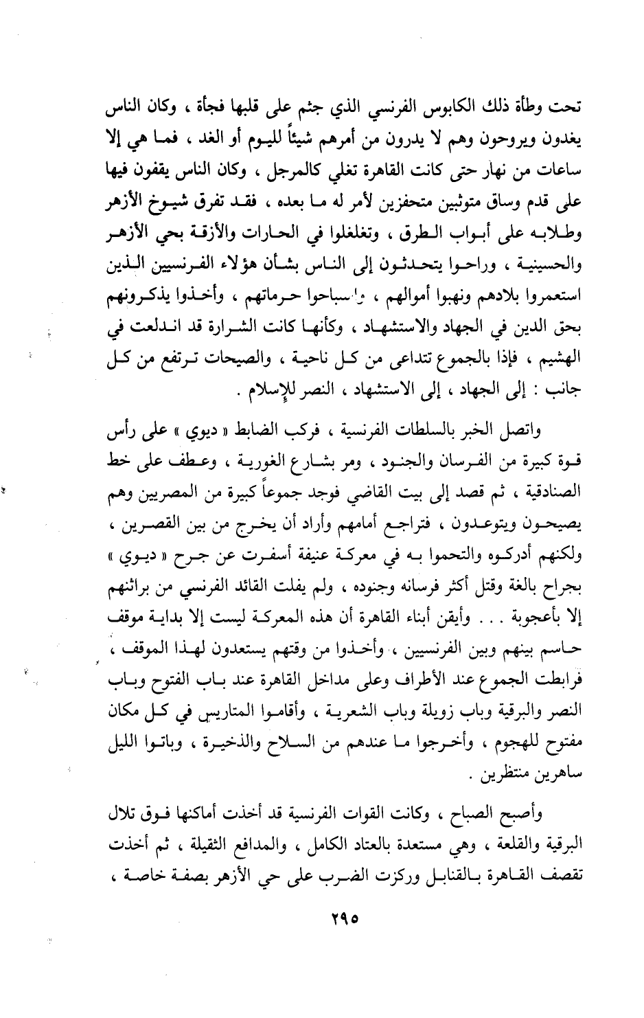 واتصل الخبر بالسلطات الفرنسية، فركب الضابط «ديوي» على رأس قوة كبيرة من الفرسان والجنود، ومر بشارع الغورية، وعطف على خط الصنادقية، ثم قصد إلى بيت القاضي فوجد جموعا كبيرة من المصريين وهم يصيحون ويتوعدون، فتراجع أمامهم وأراد أن يخرج من بين القصرين، ولكنهم أدركوه والتحموا به في معركة عنيفة أسفرت عن جرح «ديوي» بجراح بالغة وقتل أكثر فرسانه وجنوده، ولم يفلت القائد الفرنسي من براثنهم إلا بأعجوبة. . . وأيقن أبناء القاهرة أن هذه المعركة ليست إلا بداية موقف حاسم بينهم وبين الفرنسيين، وأخذوا من وقتهم يستعدون لهذا الموقف، فرابطت الجموع عند الأطراف وعلى مداخل القاهرة عند باب الفتوح وباب النصر والبرقية وباب زويلة وباب الشعرية، وأقاموا المتاريس في كل مكان مفتوح للهجوم، وأخرجوا ما عندهم من السلاح والذخيرة، وباتوا الليل ساهرين منتظرين.