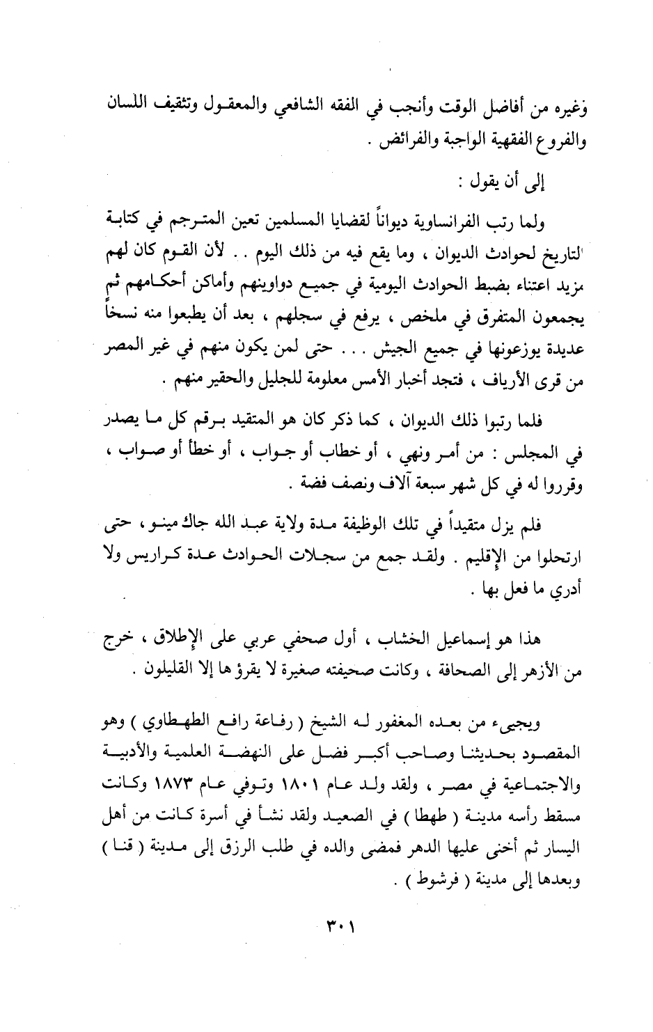 ولما رتب الفرانساوية ديوانا لقضايا المسلمين تعين المترجم في كتابة لتاريخ لحوادث الديوان، وما يقع فيه من ذلك اليوم. . لأن القوم كان لهم مزيد اعتناء بضبط الحوادث اليومية في جميع دواوينهم وأماكن أحكامهم ثم يجمعون المتفرق في ملخص، يرفع في سجلهم، بعد أن يطبعوا منه نسخا عديدة يوزعونها في جميع الجيش. . . حتى لمن يكون منهم في غير المصر من قرى الأرياف، فتجد أخبار الأمس معلومة للجليل والحقير منهم.