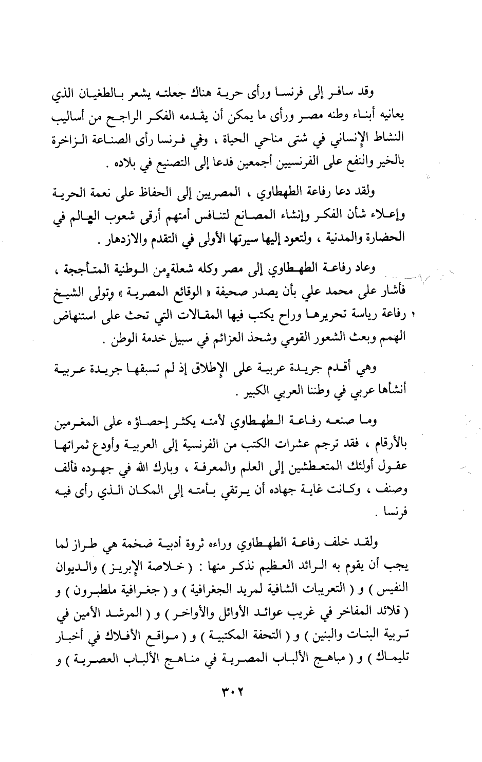ولقد خلف رفاعة الطهطاوي وراءه ثروة أدبية ضخمة هي طراز لما يجب أن يقوم به الرائد العظيم نذكر منها: (خلاصة الإبريز) والديوان النفيس) و (التعريبات الشافية لمريد الجغرافية) و (جغرافية ملطبرون) و (قلائد المفاخر في غريب عوائد الأوائل والأواخر) و (المرشد الأمين في تربية البنات والبنين) و (التحفة المكتبية) و (مواقع الأفلاك في أخبار تليماك) و (مباهج الألباب المصرية في مناهج الألباب العصرية) و