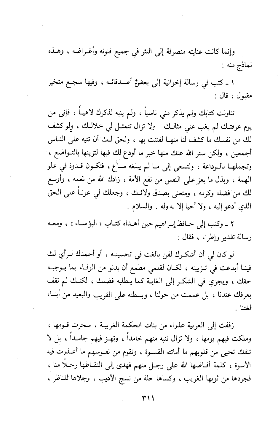 وإنما كانت عنايته منصرفة إلى النثر في جميع فنونه وأغراضه، وهذه نماذج منه: