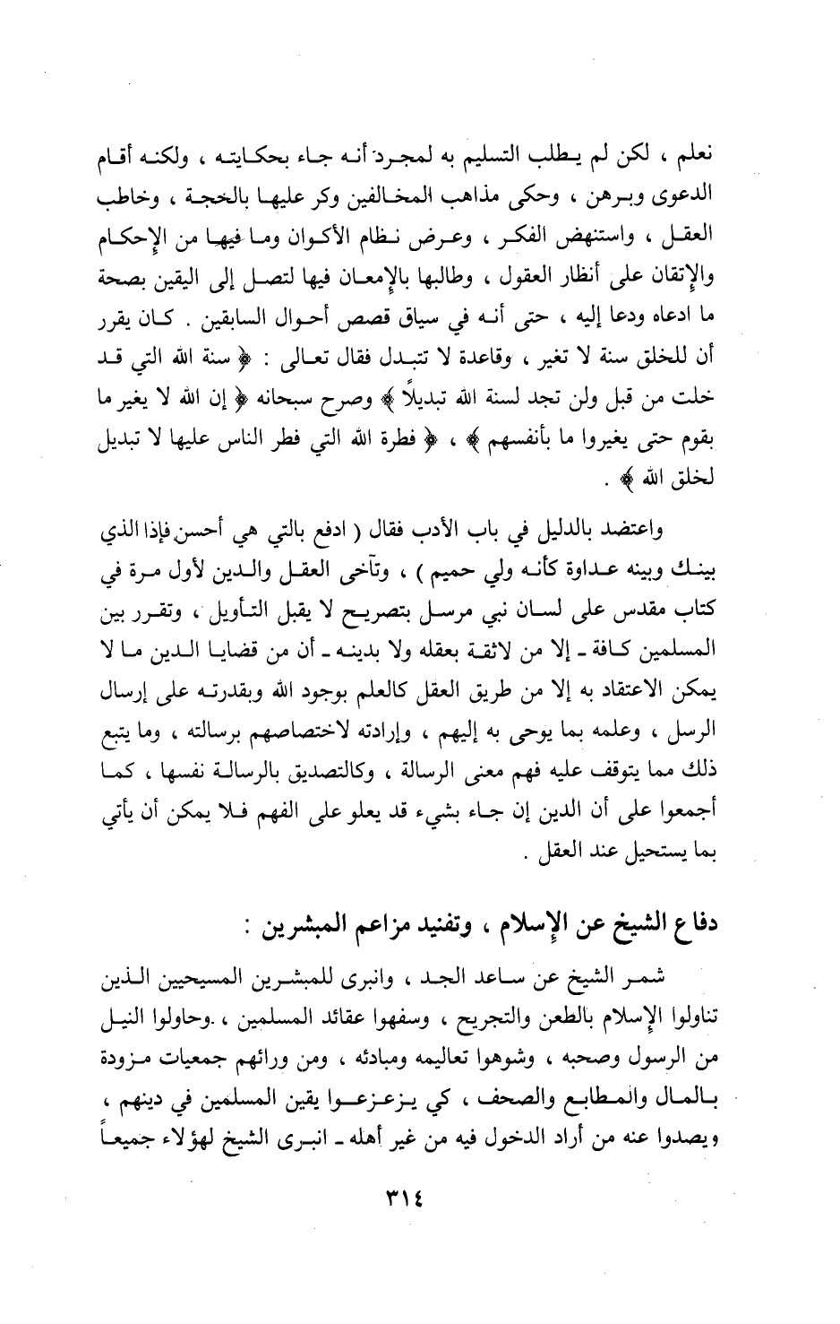 نعلم، لكن لم يطلب التسليم به لمجرد أنه جاء بحكايته، ولكنه أقام الدعوى وبرهن، وحكى مذاهب المخالفين وكر عليها بالحجة، وخاطب العقل، واستنهض الفكر، وعرض نظام الأكوان وما فيها من الإحكام والإتقان على أنظار العقول، وطالبها بالإمعان فيها لتصل إلى اليقين بصحة ما ادعاه ودعا إليه، حتى أنه في سياق قصص أحوال السابقين. كان يقرر أن للخلق سنة لا تغير، وقاعدة لا تتبدل فقال تعالى: سُنَّةَ اَللّهِ اَلَّتِي قَدْ خَلَتْ مِنْ قَبْلُ وَلَنْ تَجِدَ لِسُنَّةِ اَللّهِ تَبْدِيلاً وصرح سبحانه إِنَّ اَللّهَ لا يُغَيِّرُ ما بِقَوْمٍ حَتّى يُغَيِّرُوا ما بِأَنْفُسِهِمْ، فِطْرَتَ اَللّهِ اَلَّتِي فَطَرَ اَلنّاسَ عَلَيْها لا تَبْدِيلَ لِخَلْقِ اَللّهِ.