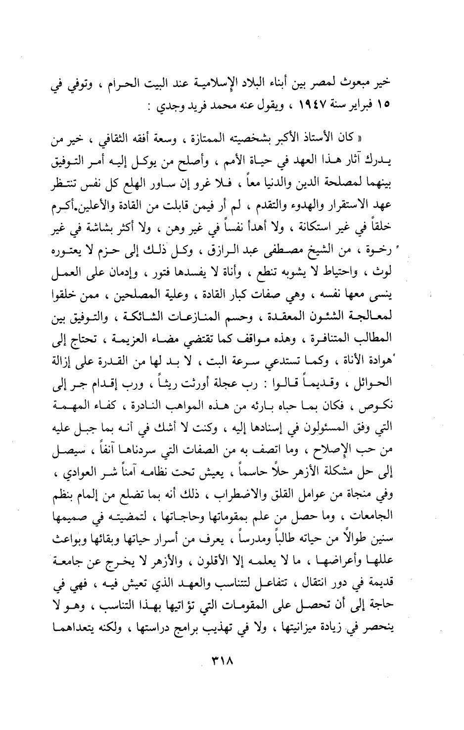 «كان الأستاذ الأكبر بشخصيته الممتازة، وسعة أفقه الثقافي، خير من يدرك آثار هذا العهد في حياة الأمم، وأصلح من يوكل إليه أمر التوفيق بينهما لمصلحة الدين والدنيا معا، فلا غرو إن ساور الهلع كل نفس تنتظر عهد الاستقرار والهدوء والتقدم، لم أر فيمن قابلت من القادة والأعلين. أكرم خلقا في غير استكانة، ولا أهدأ نفسا في غير وهن، ولا أكثر بشاشة في غير رخوة، من الشيخ مصطفى عبد الرازق، وكل ذلك إلى حزم لا يعتوره لوث، واحتياط لا يشوبه تنطع، وأناة لا يفسدها فتور، وإدمان على العمل ينسى معها نفسه، وهي صفات كبار القادة، وعلية المصلحين، ممن خلقوا لمعالجة الشئون المعقدة، وحسم المنازعات الشائكة، والتوفيق بين المطالب المتنافرة، وهذه مواقف كما تقتضي مضاء العزيمة، تحتاج إلى هوادة الأناة، وكما تستدعي سرعة البت، لا بد لها من القدرة على إزالة الحوائل، وقديما قالوا: رب عجلة أورثت ريثا، ورب إقدام جر إلى نكوص، فكان بما حباه بارئه من هذه المواهب النادرة، كفاء المهمة التي وفق المسئولون في إسنادها إليه، وكنت لا أشك في أنه بما جبل عليه من حب الإصلاح، وما اتصف به من الصفات التي سردناها آنفا، سيصل إلى حل مشكلة الأزهر حلا حاسما، يعيش تحت نظامه آمنا شر العوادي، وفي منجاة من عوامل القلق والاضطراب، ذلك أنه بما تضلع من إلمام بنظم الجامعات، وما حصل من علم بمقوماتها وحاجاتها، لتمضيته في صميمها سنين طوالا من حياته طالبا ومدرسا، يعرف من أسرار حياتها وبقائها وبواعث عللها وأعراضها، ما لا يعلمه إلا الأقلون، والأزهر لا يخرج عن جامعة قديمة في دور انتقال، تتفاعل لتتناسب والعهد الذي تعيش فيه، فهي في حاجة إلى أن تحصل على المقومات التي تؤاتيها بهذا التناسب، وهو لا ينحصر في زيادة ميزانيتها، ولا في تهذيب برامج دراستها، ولكنه يتعداهما