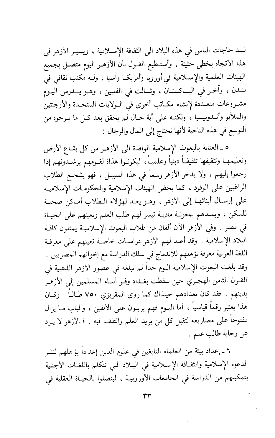 5 - العناية بالبعوث الإسلامية الوافدة الى الأزهر من كل بقاع الأرض وتعليمها وتثقيفا دينيا وعلميا، ليكونوا هذاة لقومهم يرشدونهم إذا رجعوا إليهم، ولا يدخر الأزهر وسعا في هذا السبيل، فهو يشجع الطلاب الراغبين على الوفود، كما يحض الهيئات الإسلامية والحكومات الإسلامية على إرسال أبنائها إلى الأزهر، وهو يعد لهؤلاء الطلاب أماكن صحية للسكن، ويمدهم بمعونة مادية تيسر لهم طلب العلم وتعينهم على الحياة في مصر. وفي الأزهر الآن ألفان من طلاب البعوث الإسلامية يمثلون كافة البلاد الإسلامية. وقد أعد لهم الأزهر دراسات خاصة تعينهم على معرفة اللغة العربية معرفة تؤهلهم للاندماج في سلك الدراسة مع إخوانهم المصريين.