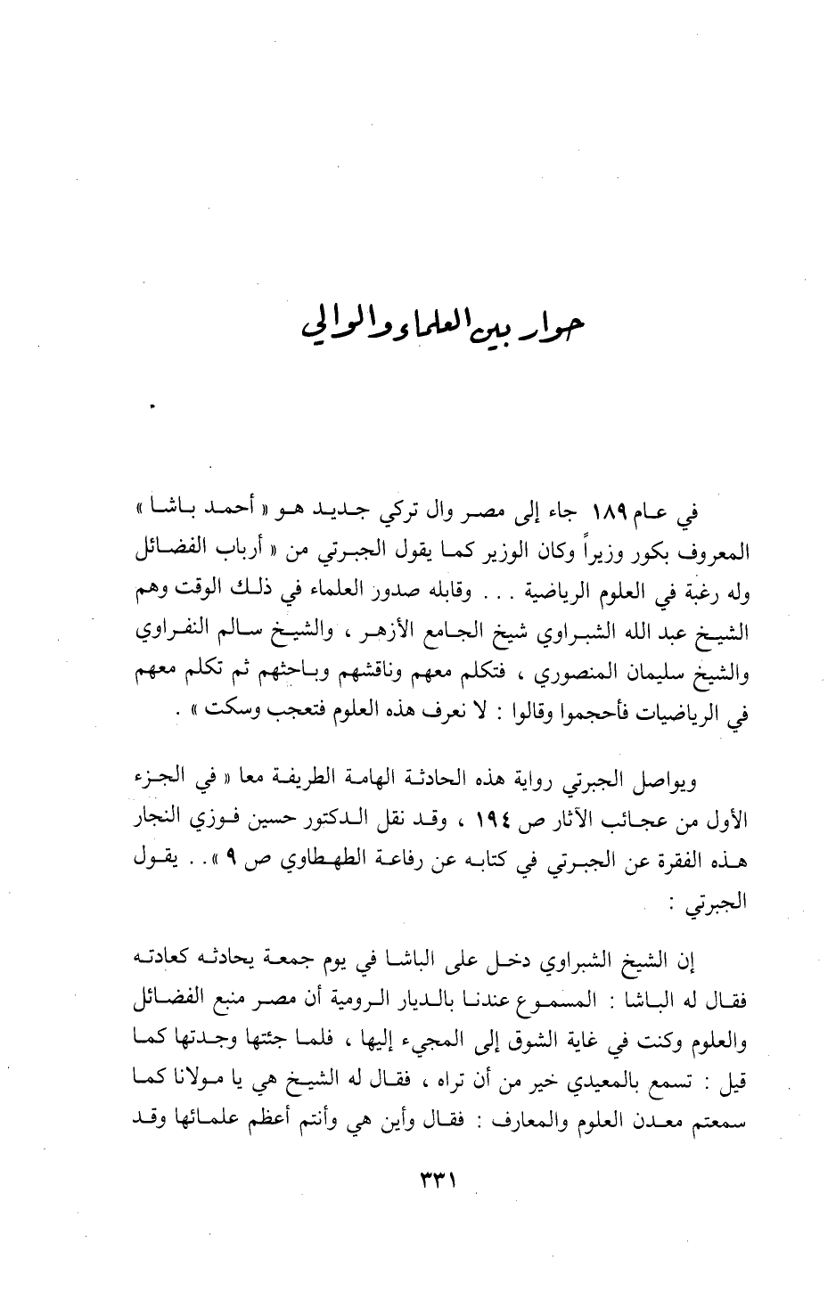 في عام 189 جاء إلى مصر وال تركي جديد هو «أحمد باشا» المعروف بكور وزيرا وكان الوزير كما يقول الجبرتي من «أرباب الفضائل وله رغبة في العلوم الرياضية. . . وقابله صدور العلماء في ذلك الوقت وهم الشيخ عبد الله الشبراوي شيخ الجامع الأزهر، والشيخ سالم النفراوي والشيخ سليمان المنصوري، فتكلم معهم وناقشهم وباحثهم ثم تكلم معهم في الرياضيات فأحجموا وقالوا: لا نعرف هذه العلوم فتعجب وسكت».