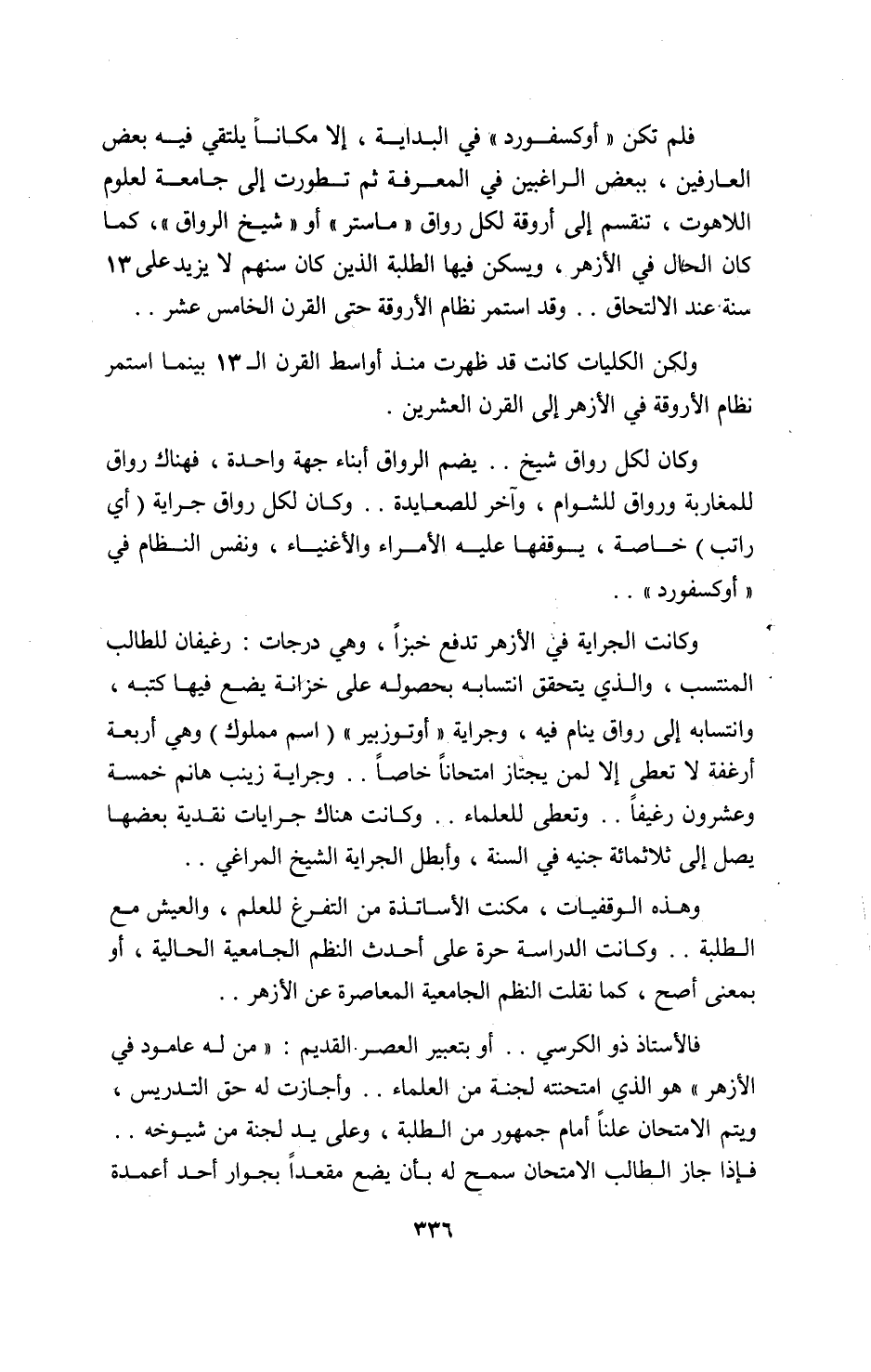 وكان لكل رواق شيخ. . يضم الرواق أبناء جهة واحدة، فهناك رواق للمغاربة ورواق للشوام، وآخر للصعايدة. . وكان لكل رواق جراية (أي راتب) خاصة، يوقفها عليه الأمراء والأغنياء، ونفس النظام في «أوكسفورد». .
