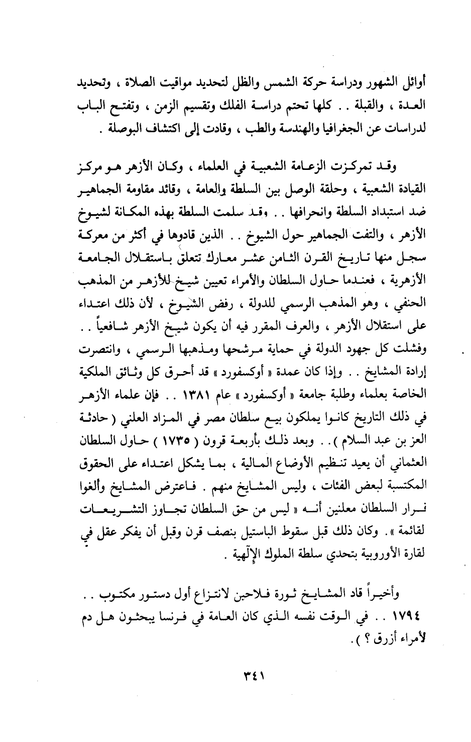 وفشلت كل جهود الدولة في حماية مرشحها ومذهبها الرسمي، وانتصرت إرادة المشايخ. . وإذا كان عمدة «أوكسفورد» قد أحرق كل وثائق الملكية الخاصة بعلماء وطلبة جامعة «أوكسفورد» عام 1381. . فإن علماء الأزهر في ذلك التاريخ كانوا يملكون بيع سلطان مصر في المزاد العلني (حادثة العز بن عبد السلام). . وبعد ذلك بأربعة قرون (1735) حاول السلطان العثماني أن يعيد تنظيم الأوضاع المالية، بما يشكل اعتداء على الحقوق المكتسبة لبعض الفئات، وليس المشايخ منهم. فاعترض المشايخ وألغوا قرار السلطان معلنين أنه «ليس من حق السلطان تجاوز التشريعات لقائمة». وكان ذلك قبل سقوط الباستيل بنصف قرن وقبل أن يفكر عقل في لقارة الأوروبية بتحدي سلطة الملوك الإلهية.