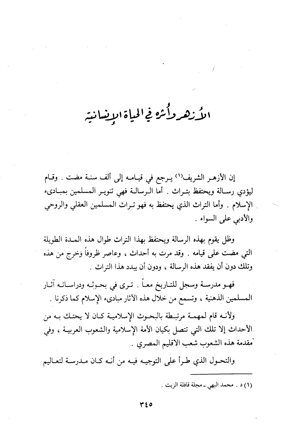 إن الأزهر الشريف 1 يرجع في قيامه إلى ألف سنة مضت. وقام ليؤدي رسالة ويحتفظ بتراث. أما الرسالة فهي تنوير المسلمين بمبادىء الإسلام. وأما التراث الذي يحتفظ به فهو تراث المسلمين العقلي والروحي والأدبي على السواء.