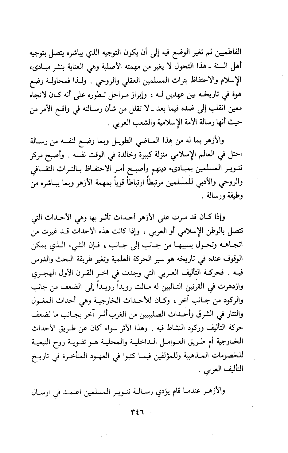 الفاطميين ثم تغير الوضع فيه إلى أن يكون التوجيه الذي يباشره يتصل بتوجيه أهل السنة-هذا التحول لا يغير من مهمته الأصلية وهي العناية بنشر مبادىء الإسلام والاحتفاظ بتراث المسلمين العقلي والروحي. ولذا فمحاولة وضع هوة في تاريخه بين عهدين له، وإبراز مراحل تطوره على أنه كان لاتجاه معين انقلب إلى ضده فيما بعد-لا تقلل من شأن رسالته في واقع الأمر من حيث أنها رسالة الأمة الإسلامية والشعب العربي.