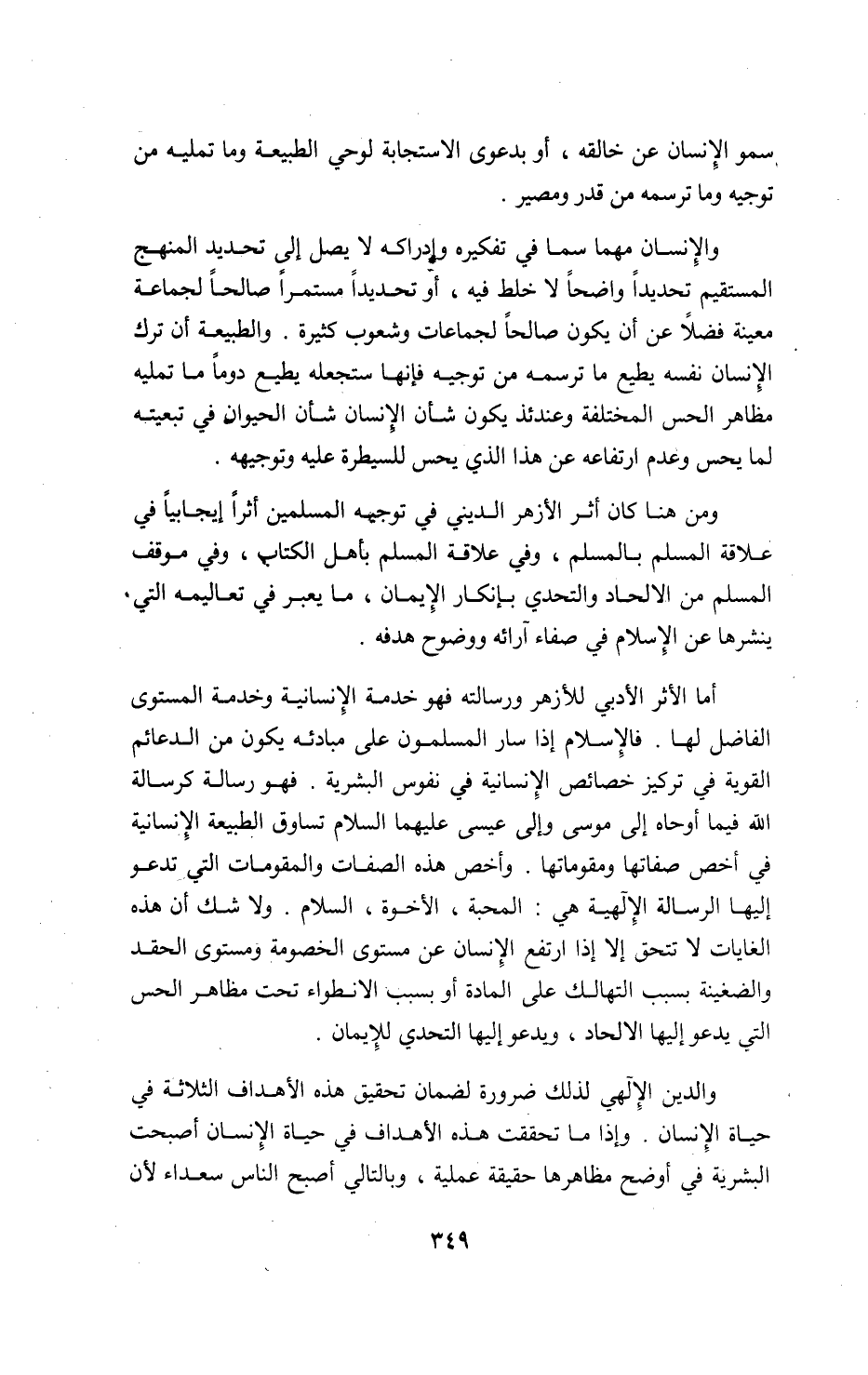 أما الأثر الأدبي للأزهر ورسالته فهو خدمة الإنسانية وخدمة المستوى الفاضل لها. فالإسلام إذا سار المسلمون على مبادئه يكون من الدعائم القوية في تركيز خصائص الإنسانية في نفوس البشرية. فهو رسالة كرسالة اللّه فيما أوحاه إلى موسى وإلى عيسى عليهما السلام تساوق الطبيعة الإنسانية في أخص صفاتها ومقوماتها. وأخص هذه الصفات والمقومات التي تدعو إليها الرسالة الإلهية هي: المحبة، الأخوة، السلام. ولا شك أن هذه الغايات لا تتحق إلا إذا ارتفع الإنسان عن مستوى الخصومة ومستوى الحقد والضغينة بسبب التهالك على المادة أو بسبب الانطواء تحت مظاهر الحس التي يدعو إليها الالحاد، ويدعو إليها التحدي للإيمان.
