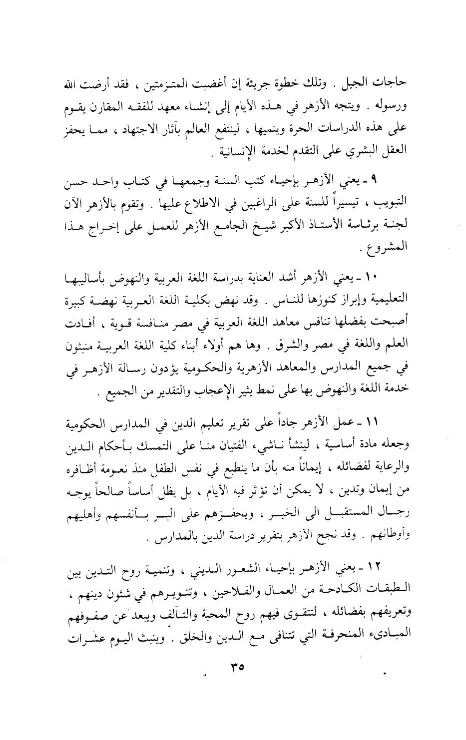 9 - يعني الأزهر بإحياء كتب السنة وجمعها في كتاب واحد حسن التبويب، تيسيرا للسنة على الراغبين في الاطلاع عليها. وتقوم بالأزهر الآن لجنة برئاسة الأستاذ الأكبر شيخ الجامع الأزهر للعمل على إخراج هذا المشروع.