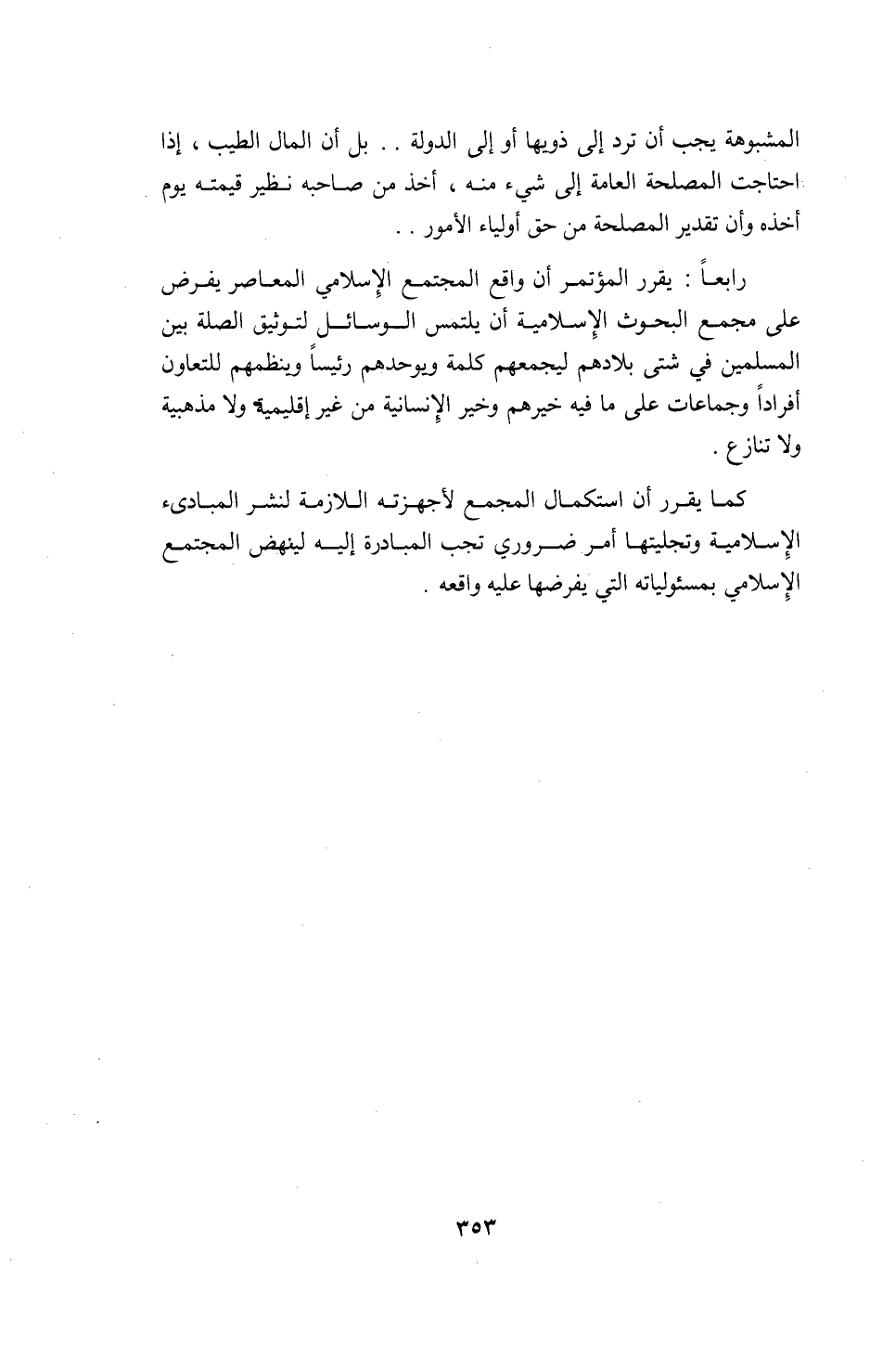 المشبوهة يجب أن ترد إلى ذويها أو إلى الدولة. . بل أن المال الطيب، إذا احتاجت المصلحة العامة إلى شيء منه، أخذ من صاحبه نظير قيمته يوم أخذه وأن تقدير المصلحة من حق أولياء الأمور. .