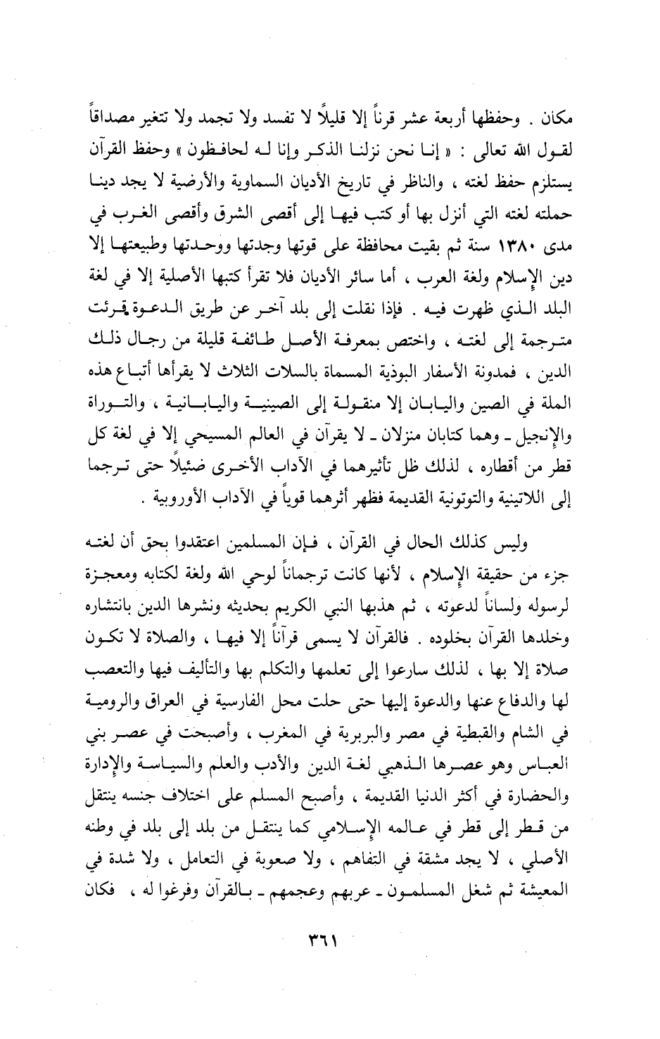 مكان. وحفظها أربعة عشر قرنا إلا قليلا لا تفسد ولا تجمد ولا تتغير مصداقا لقول اللّه تعالى: «إِنّا نَحْنُ نَزَّلْنَا اَلذِّكْرَ وَإِنّا لَهُ لَحافِظُونَ» وحفظ القرآن يستلزم حفظ لغته، والناظر في تاريخ الأديان السماوية والأرضية لا يجد دينا حملته لغته التي أنزل بها أو كتب فيها إلى أقصى الشرق وأقصى الغرب في مدى 1380 سنة ثم بقيت محافظة على قوتها وجدتها ووحدتها وطبيعتها إلا دين الإسلام ولغة العرب، أما سائر الأديان فلا تقرأ كتبها الأصلية إلا في لغة البلد الذي ظهرت فيه. فإذا نقلت إلى بلد آخر عن طريق الدعوة قرئت مترجمة إلى لغته، واختص بمعرفة الأصل طائفة قليلة من رجال ذلك الدين، فمدونة الأسفار البوذية المسماة بالسلات الثلاث لا يقرأها أتباع هذه الملة في الصين واليابان إلا منقولة إلى الصينية واليابانية، والتوراة والإنجيل-و هما كتابان منزلان-لا يقرآن في العالم المسيحي إلا في لغة كل قطر من أقطاره، لذلك ظل تأثيرهما في الآداب الأخرى ضئيلا حتى ترجما إلى اللاتينية والتوتونية القديمة فظهر أثرهما قويا في الآداب الأوروبية.