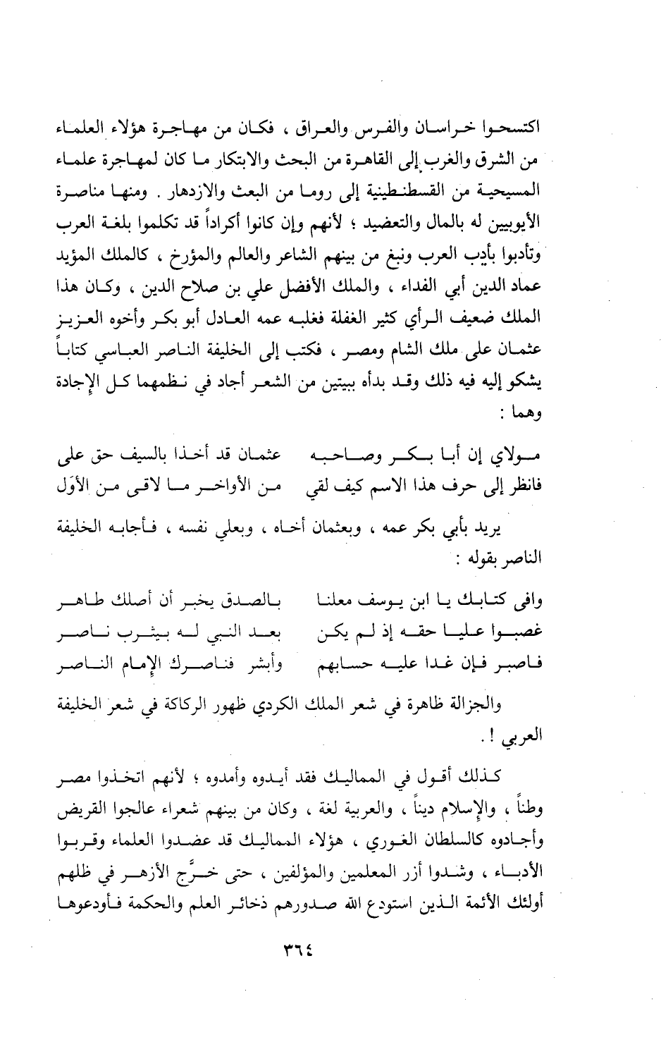 اكتسحوا خراسان والفرس والعراق، فكان من مهاجرة هؤلاء العلماء من الشرق والغرب إلى القاهرة من البحث والابتكار ما كان لمهاجرة علماء المسيحية من القسطنطينية إلى روما من البعث والازدهار. ومنها مناصرة الأيوبيين له بالمال والتعضيد؛ لأنهم وإن كانوا أكرادا قد تكلموا بلغة العرب وتأدبوا بأدب العرب ونبغ من بينهم الشاعر والعالم والمؤرخ، كالملك المؤيد عماد الدين أبي الفداء، والملك الأفضل علي بن صلاح الدين، وكان هذا الملك ضعيف الرأي كثير الغفلة فغلبه عمه العادل أبو بكر وأخوه العزيز عثمان على ملك الشام ومصر، فكتب إلى الخليفة الناصر العباسي كتابا يشكو إليه فيه ذلك وقد بدأه ببيتين من الشعر أجاد في نظمهما كل الإجادة وهما: