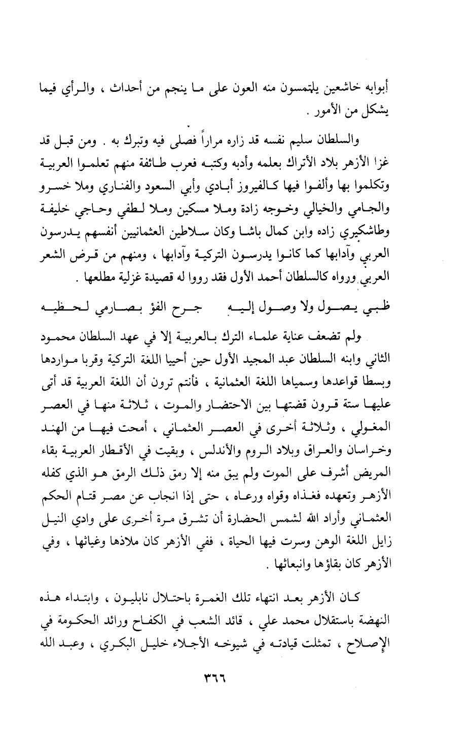 ولم تضعف عناية علماء الترك بالعربية إلا في عهد السلطان محمود الثاني وابنه السلطان عبد المجيد الأول حين أحييا اللغة التركية وقربا مواردها وبسطا قواعدها وسمياها اللغة العثمانية، فأنتم ترون أن اللغة العربية قد أتى عليها ستة قرون قضتها بين الاحتضار والموت، ثلاثة منها في العصر المغولي، وثلاثة أخرى في العصر العثماني، أمحت فيها من الهند وخراسان والعراق وبلاد الروم والأندلس، وبقيت في الأقطار العربية بقاء المريض أشرف على الموت ولم يبق منه إلا رمق ذلك الرمق هو الذي كفله الأزهر وتعهده فغذاه وقواه ورعاه، حتى إذا انجاب عن مصر قتام الحكم العثماني وأراد اللّه لشمس الحضارة أن تشرق مرة أخرى على وادي النيل زايل اللغة الوهن وسرت فيها الحياة، ففي الأزهر كان ملاذها وغياثها، وفي الأزهر كان بقاؤها وانبعاثها.