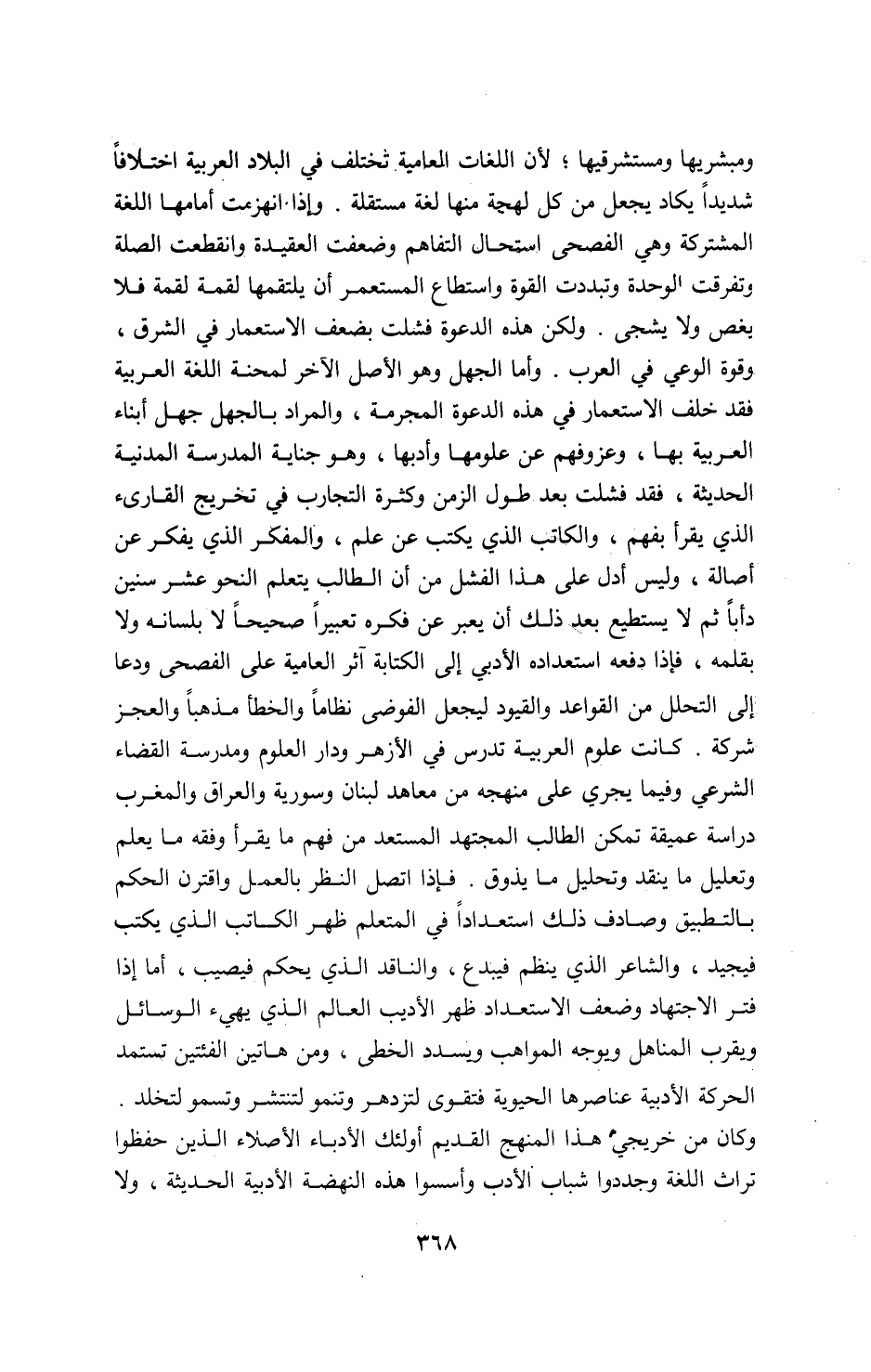 ومبشريها ومستشرقيها؛ لأن اللغات العامية تختلف في البلاد العربية اختلافا شديدا يكاد يجعل من كل لهجة منها لغة مستقلة. وإذا انهزمت أمامها اللغة المشتركة وهي الفصحى استحال التفاهم وضعفت العقيدة وانقطعت الصلة وتفرقت الوحدة وتبددت القوة واستطاع المستعمر أن يلتقمها لقمة لقمة فلا يغص ولا يشجى. ولكن هذه الدعوة فشلت بضعف الاستعمار في الشرق، وقوة الوعي في العرب. وأما الجهل وهو الأصل الآخر لمحنة اللغة العربية فقد خلف الاستعمار في هذه الدعوة المجرمة، والمراد بالجهل جهل أبناء العربية بها، وعزوفهم عن علومها وأدبها، وهو جناية المدرسة المدنية الحديثة، فقد فشلت بعد طول الزمن وكثرة التجارب في تخريج القارىء الذي يقرأ بفهم، والكاتب الذي يكتب عن علم، والمفكر الذي يفكر عن أصالة، وليس أدل على هذا الفشل من أن الطالب يتعلم النحو عشر سنين دأبا ثم لا يستطيع بعد ذلك أن يعبر عن فكره تعبيرا صحيحا لا بلسانه ولا بقلمه، فإذا دفعه استعداده الأدبي إلى الكتابة آثر العامية على الفصحى ودعا إلى التحلل من القواعد والقيود ليجعل الفوضى نظاما والخطأ مذهبا والعجز شركة. كانت علوم العربية تدرس في الأزهر ودار العلوم ومدرسة القضاء الشرعي وفيما يجري على منهجه من معاهد لبنان وسورية والعراق والمغرب دراسة عميقة تمكن الطالب المجتهد المستعد من فهم ما يقرأ وفقه ما يعلم وتعليل ما ينقد وتحليل ما يذوق. فإذا اتصل النظر بالعمل واقترن الحكم بالتطبيق وصادف ذلك استعدادا في المتعلم ظهر الكاتب الذي يكتب فيجيد، والشاعر الذي ينظم فيبدع، والناقد الذي يحكم فيصيب، أما إذا فتر الاجتهاد وضعف الاستعداد ظهر الأديب العالم الذي يهيء الوسائل ويقرب المناهل ويوجه المواهب ويسدد الخطى، ومن هاتين الفئتين تستمد الحركة الأدبية عناصرها الحيوية فتقوى لتزدهر وتنمو لتنتشر وتسمو لتخلد.