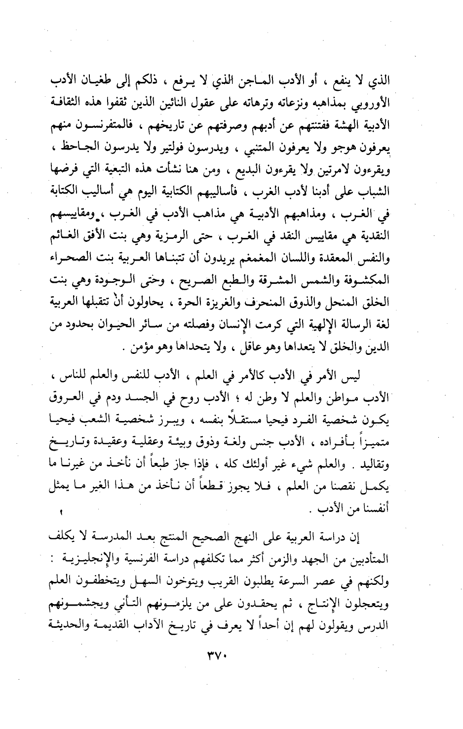 ليس الأمر في الأدب كالأمر في العلم، الأدب للنفس والعلم للناس، الأدب مواطن والعلم لا وطن له؛ الأدب روح في الجسد ودم في العروق يكون شخصية الفرد فيحيا مستقلا بنفسه، ويبرز شخصية الشعب فيحيا متميزا بأفراده، الأدب جنس ولغة وذوق وبيئة وعقلية وعقيدة وتاريخ وتقاليد. والعلم شيء غير أولئك كله، فإذا جاز طبعا أن نأخذ من غيرنا ما يكمل نقصنا من العلم، فلا يجوز قطعا أن نأخذ من هذا الغير ما يمثل أنفسنا من الأدب.