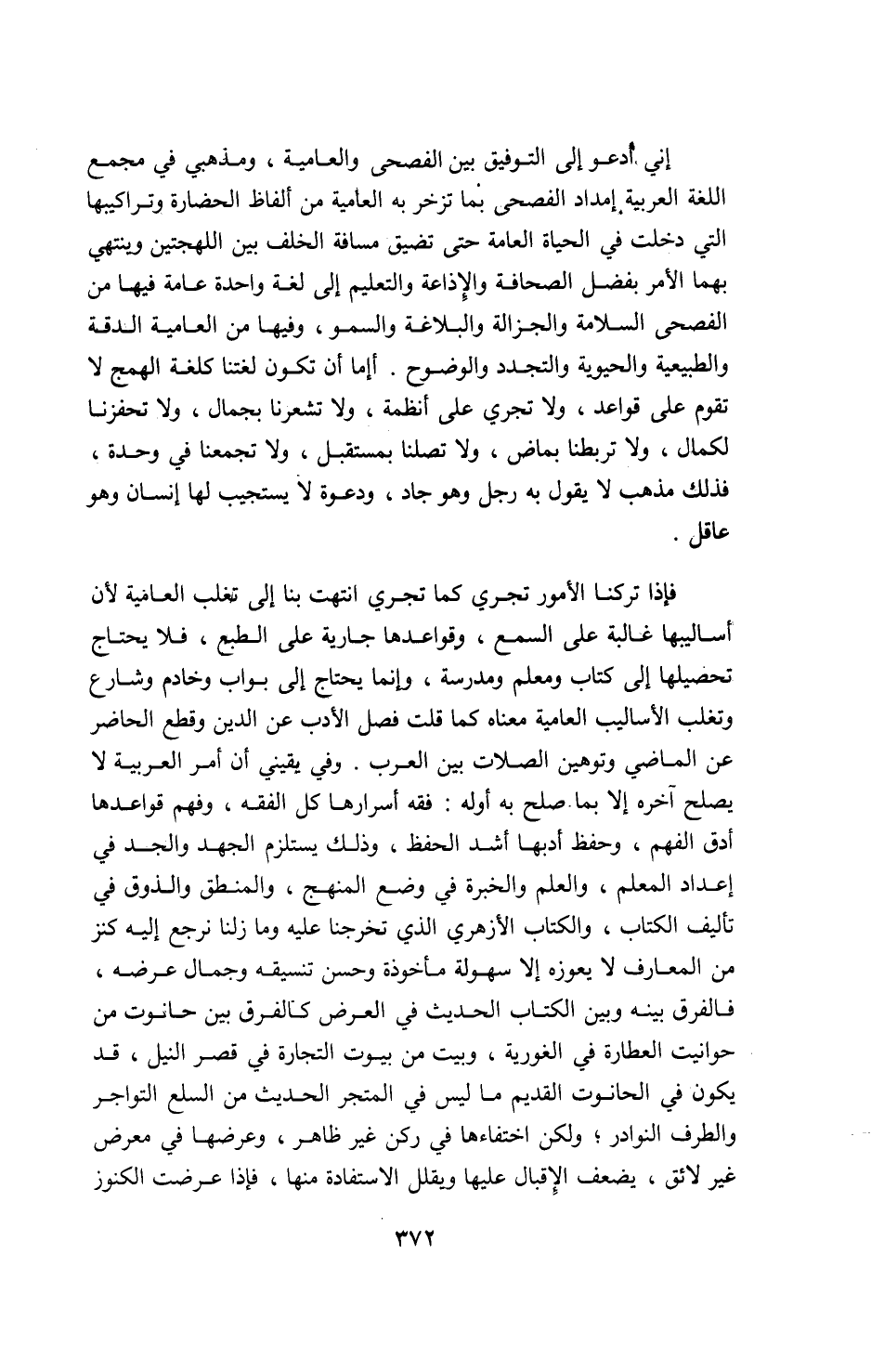 إني أدعو إلى التوفيق بين الفصحى والعامية، ومذهبي في مجمع اللغة العربية إمداد الفصحى بما تزخر به العامية من ألفاظ الحضارة وتراكيبها التي دخلت في الحياة العامة حتى تضيق مسافة الخلف بين اللهجتين وينتهي بهما الأمر بفضل الصحافة والإذاعة والتعليم إلى لغة واحدة عامة فيها من الفصحى السلامة والجزالة والبلاغة والسمو، وفيها من العامية الدقة والطبيعية والحيوية والتجدد والوضوح. أما أن تكون لغتنا كلغة الهمج لا تقوم على قواعد، ولا تجري على أنظمة، ولا تشعرنا بجمال، ولا تحفزنا لكمال، ولا تربطنا بماض، ولا تصلنا بمستقبل، ولا تجمعنا في وحدة، فذلك مذهب لا يقول به رجل وهو جاد، ودعوة لا يستجيب لها إنسان وهو عاقل.