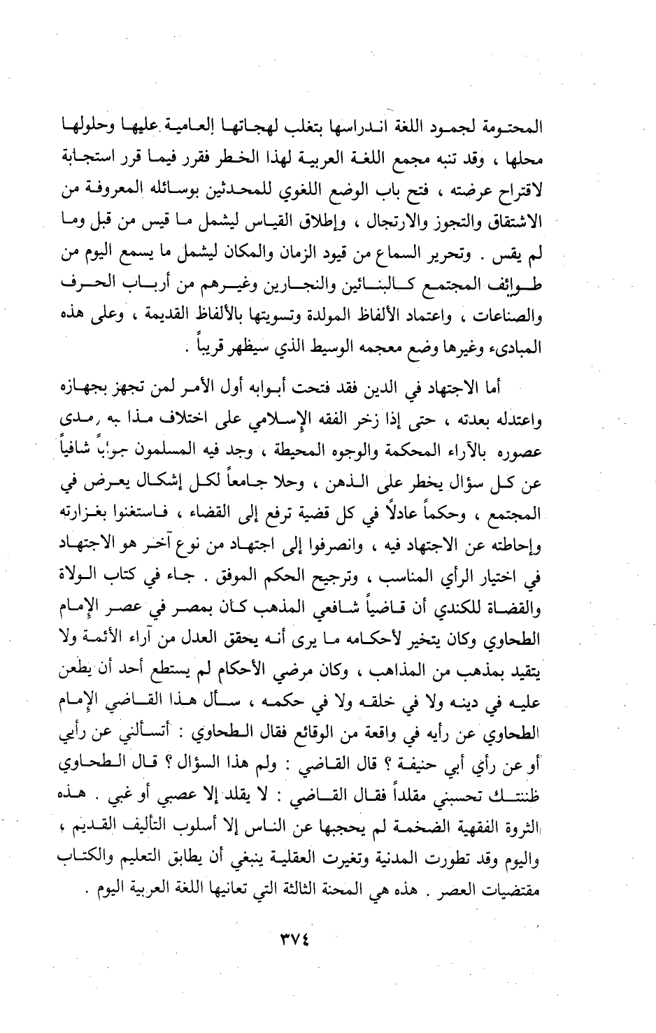 أما الاجتهاد في الدين فقد فتحت أبوابه أول الأمر لمن تجهز بجهازه واعتد له بعدته، حتى إذا زخر الفقه الإسلامي على اختلاف مذاهبه مدى عصوره بالآراء المحكمة والوجوه المحيطة، وجد فيه المسلمون جوابا شافيا عن كل سؤال يخطر على الذهن، وحلا جامعا لكل إشكال يعرض في المجتمع، وحكما عادلا في كل قضية ترفع إلى القضاء، فاستغنوا بغزارته وإحاطته عن الاجتهاد فيه، وانصرفوا إلى اجتهاد من نوع آخر هو الاجتهاد في اختيار الرأي المناسب، وترجيح الحكم الموفق. جاء في كتاب الولاة والقضاة للكندي أن قاضيا شافعي المذهب كان بمصر في عصر الإمام الطحاوي وكان يتخير لأحكامه ما يرى أنه يحقق العدل من آراء الأئمة ولا يتقيد بمذهب من المذاهب، وكان مرضي الأحكام لم يستطع أحد أن يطعن عليه في دينه ولا في خلقه ولا في حكمه، سأل هذا القاضي الإمام الطحاوي عن رأيه في واقعة من الوقائع فقال الطحاوي: أ تسألني عن رأيي أو عن رأي أبي حنيفة؟ قال القاضي: ولم هذا السؤال؟ قال الطحاوي ظننتك تحسبني مقلدا فقال القاضي: لا يقلد إلا عصبي أو غبي. هذه الثروة الفقهية الضخمة لم يحجبها عن الناس إلا أسلوب التأليف القديم، واليوم وقد تطورت المدينة وتغيرت العقلية ينبغي أن يطابق التعليم والكتاب مقتضيات العصر. هذه هي المحنة الثالثة التي تعانيها اللغة العربية اليوم.